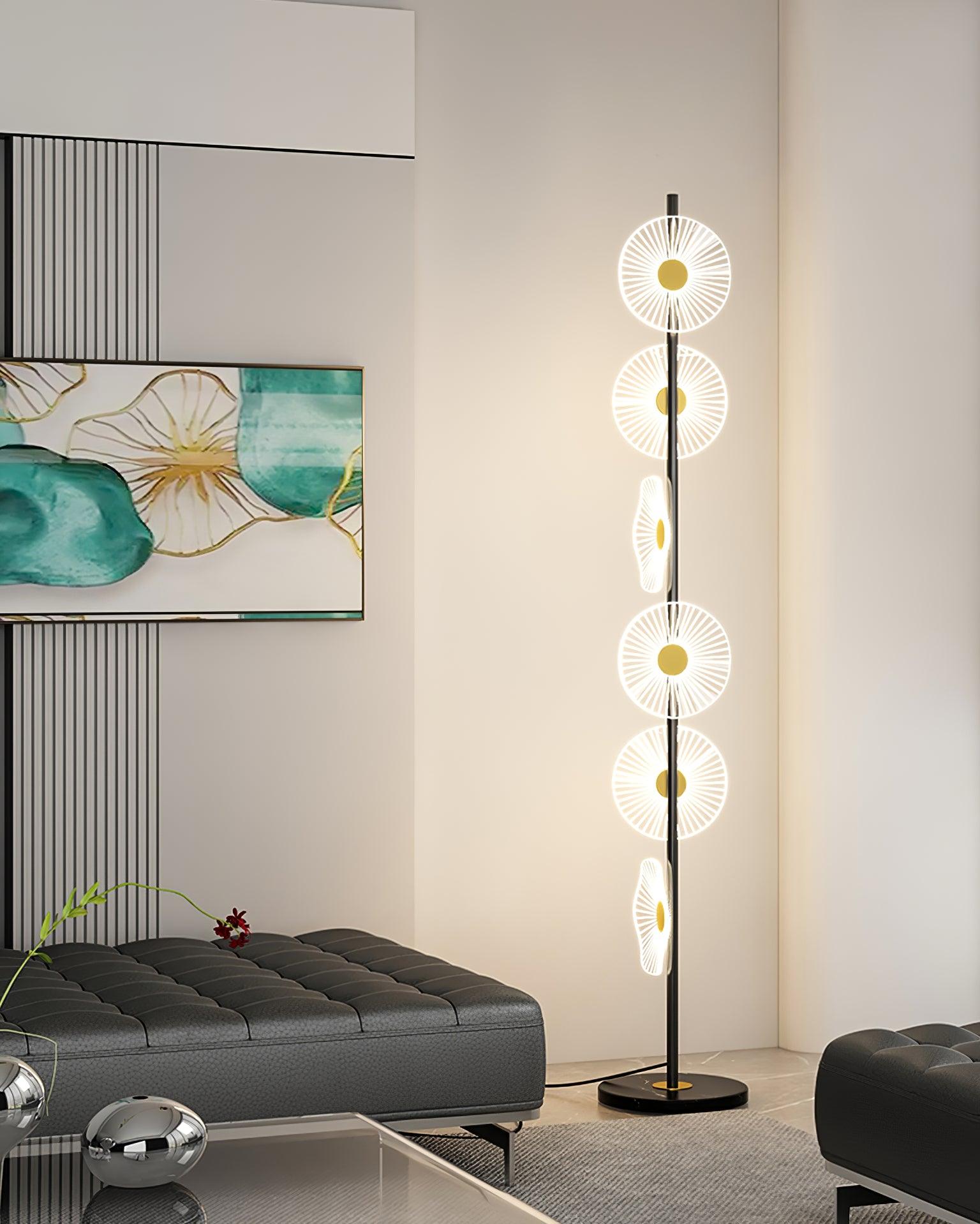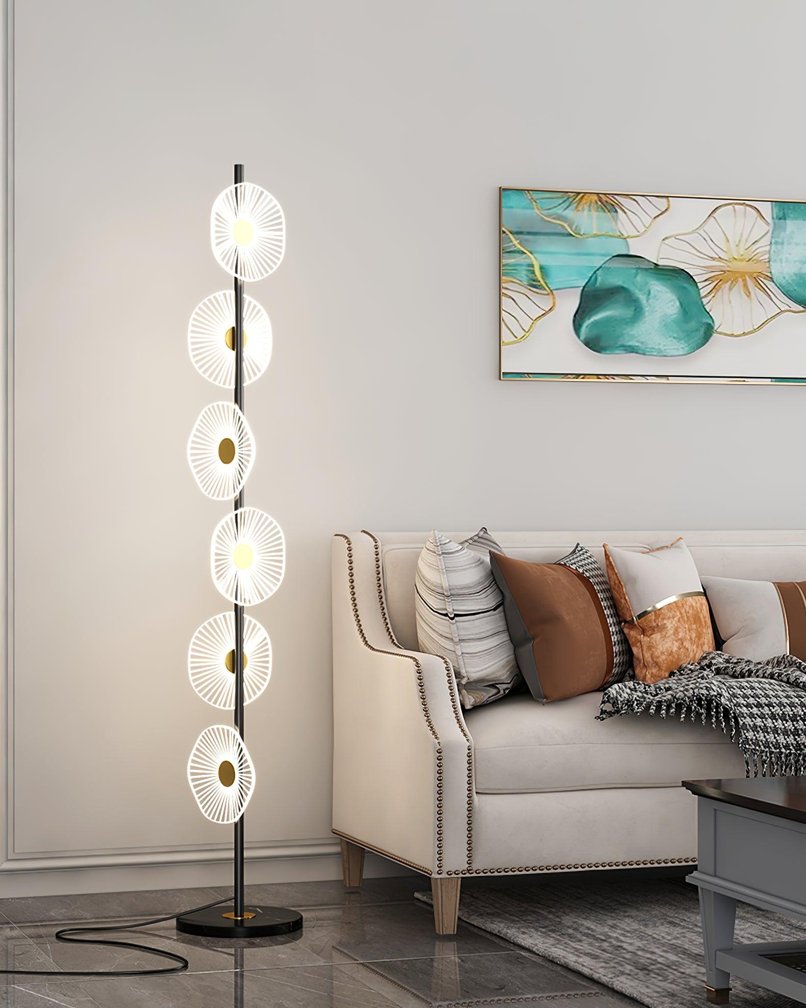 Smooth marble tops hold these unique acrylic pieces as they playfully diffuse an energy-efficient layer of illumination, bringing a warm, beautiful display of light with some elegant flair to their surroundings. The light in a falling-leaves formation with tiered shape, creating a diffused ambient glow.