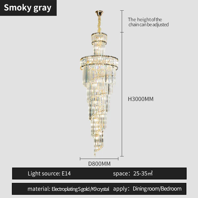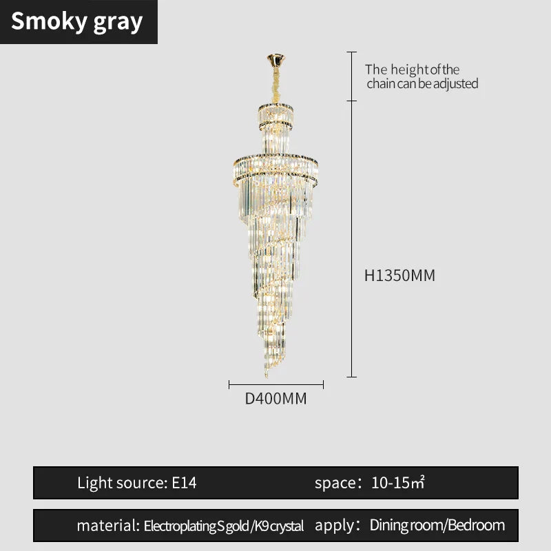 Illuminate your space with style and luxury with the Crystal Spiral Chandelier Duplex. Elevate your decor and create a captivating ambiance that will leave a lasting impression on all who enter your space. Experience the perfect blend of beauty and functionality with this exquisite chandelier.