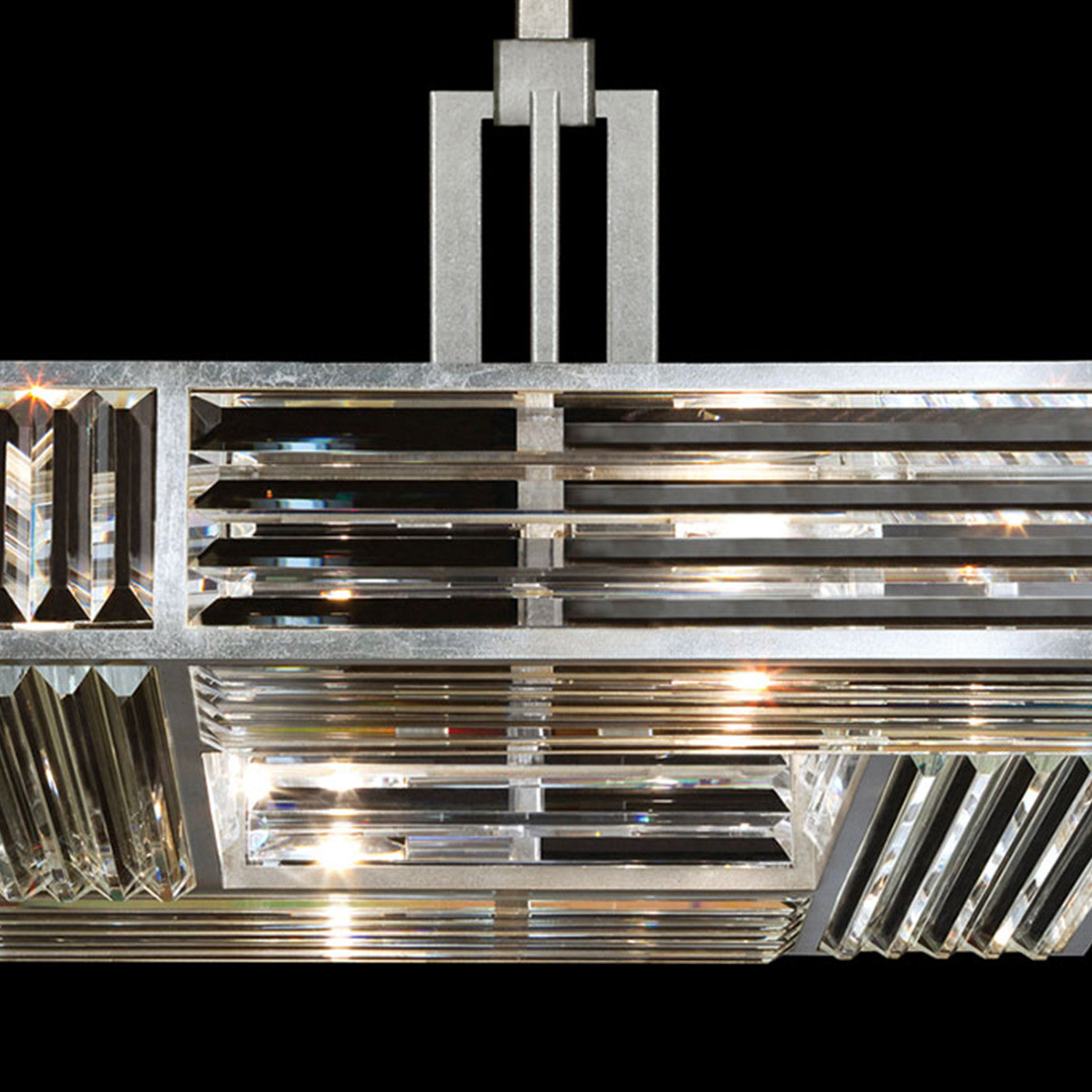 Chandelier in a modern design of multi-faceted crystal panels, set in metal frames that refract light and create an enchanting aura highlighting appointments and transforming a space with extraordinary effect. Available in Silver and Gold finish.