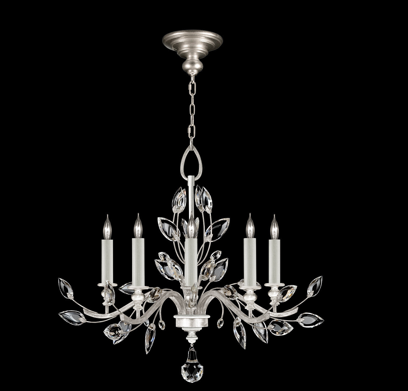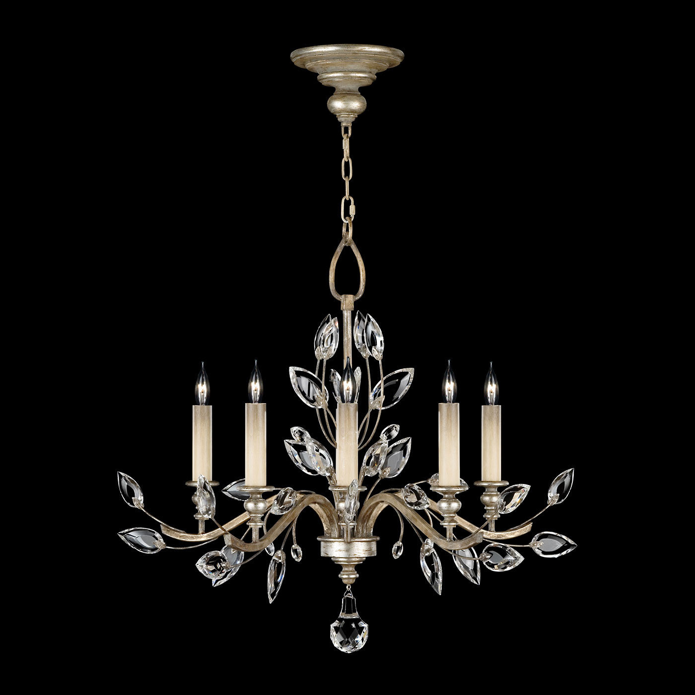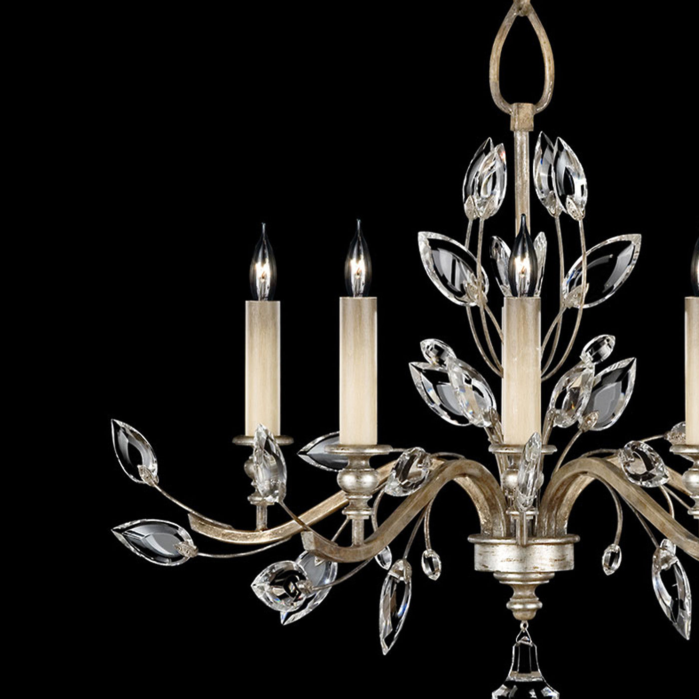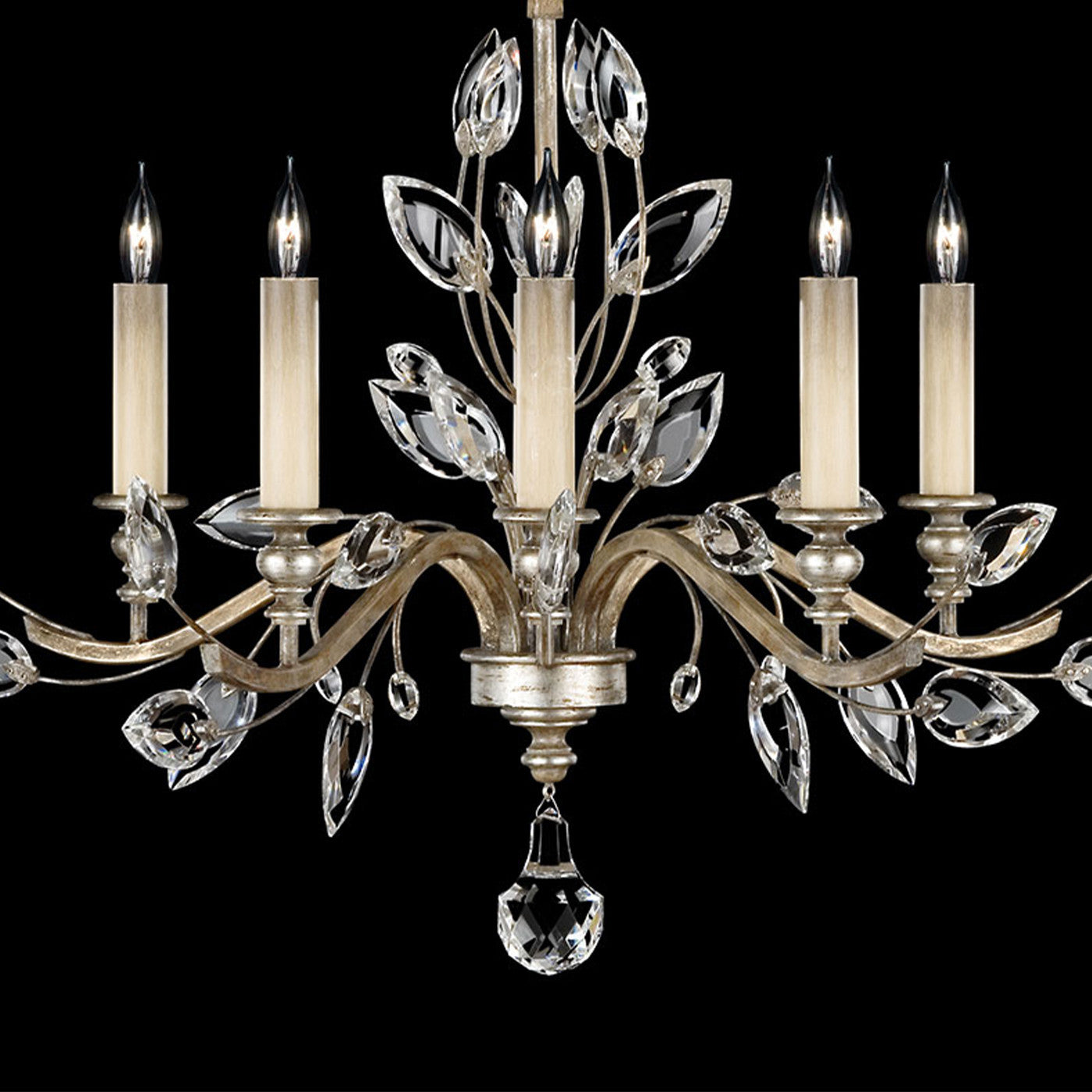 Chandelier with antiqued candlesticks featuring stylized faceted crystal leaves. Available in Silver, Gold, Silver Leaf and Gold Leaf finish.