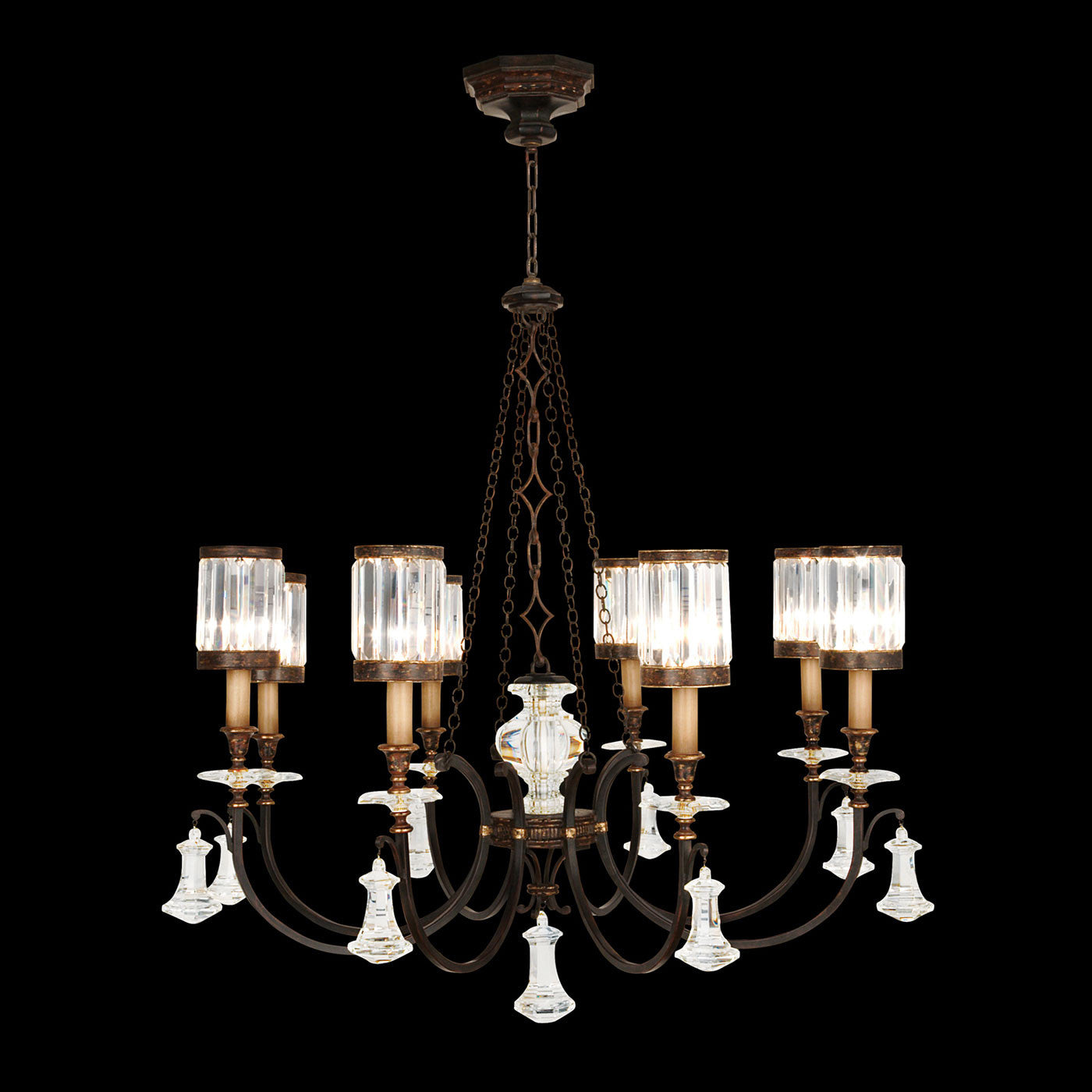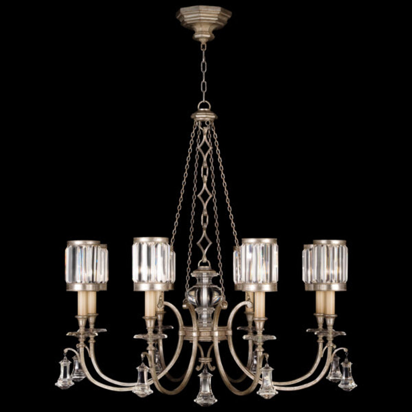 Chandelier with faceted channel set crystal shades and brilliant pendant accents. Available in Silver and Bronze finish.