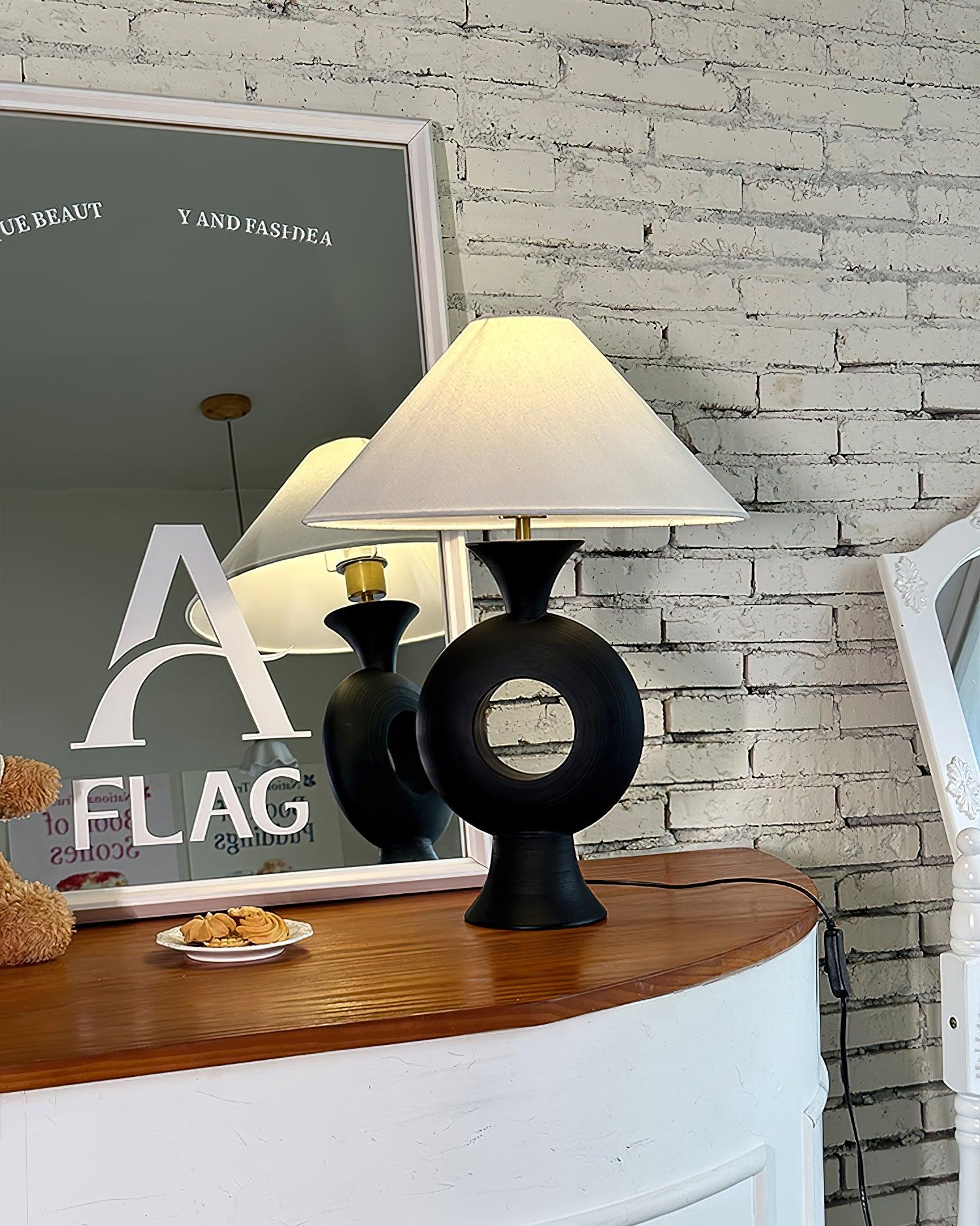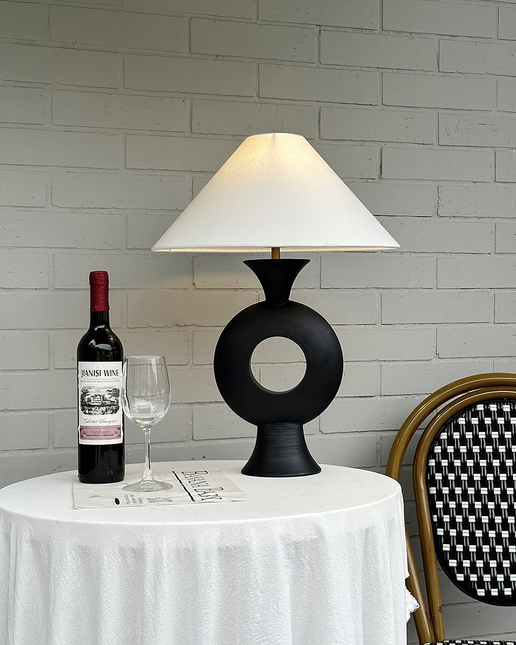 The Eclipse Table Lamp features a distinctive round base with a central opening. This modern, artistic design combines a sleek lamp body with a classic white shade, creating a striking contrast. The unique shape and elegant lines of this lamp make it the perfect addition to contemporary interiors, combining practicality with an air of cosmic elegance.