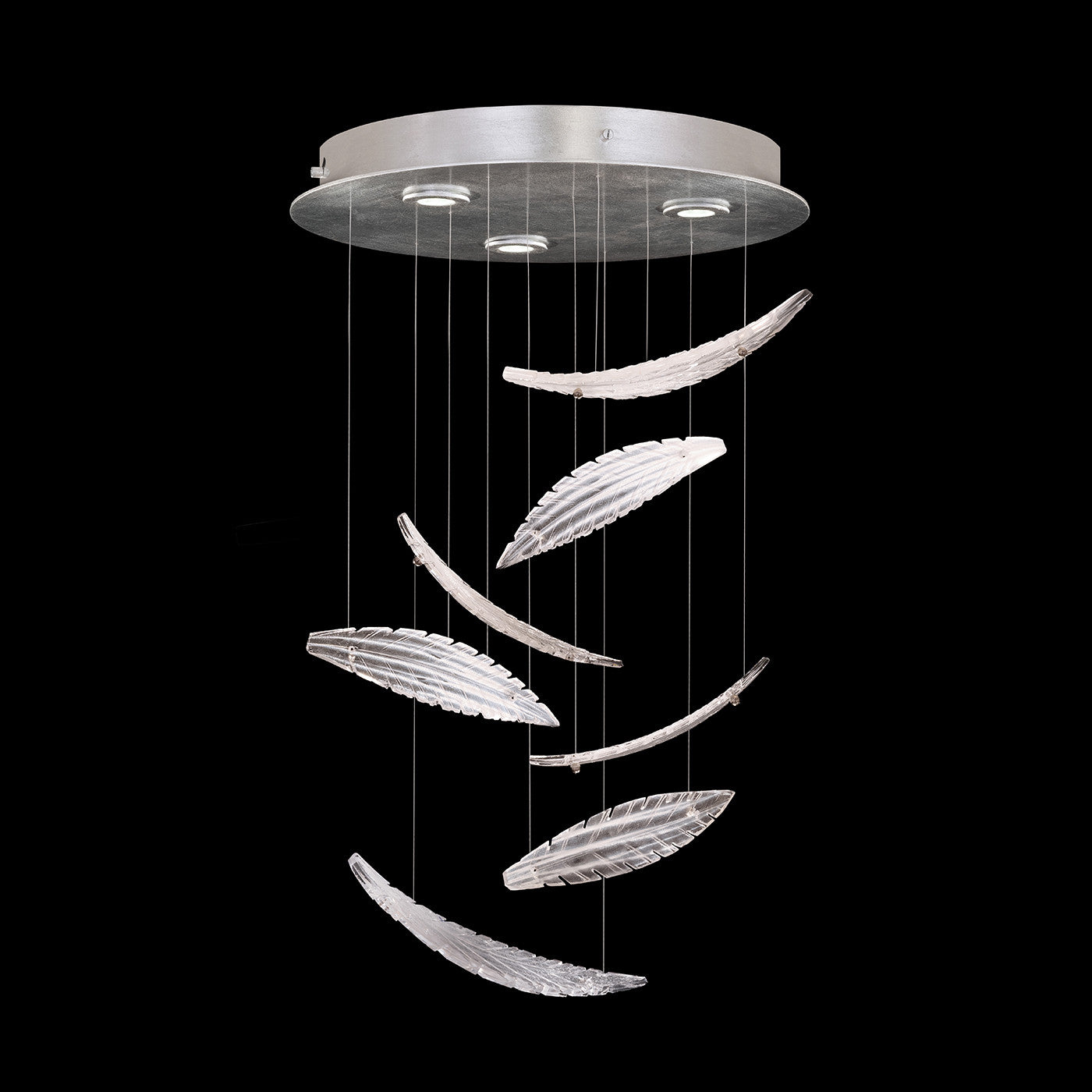 Illuminated from an elegant canopy, this Made in America round fixture is suspended by adjustable cables, making it an excellent choice for rooms with low ceilings. Featuring varying quantities of glass pieces based on the selected configuration. Available in Silver Leaf and Soft Gold Leaf finish with either Dichroic Plumes, White Plumes, Crystal Stardust Spires, Ebony Stardust Spires, Meteorite Spires, Frozen Pages or Blank Pages.