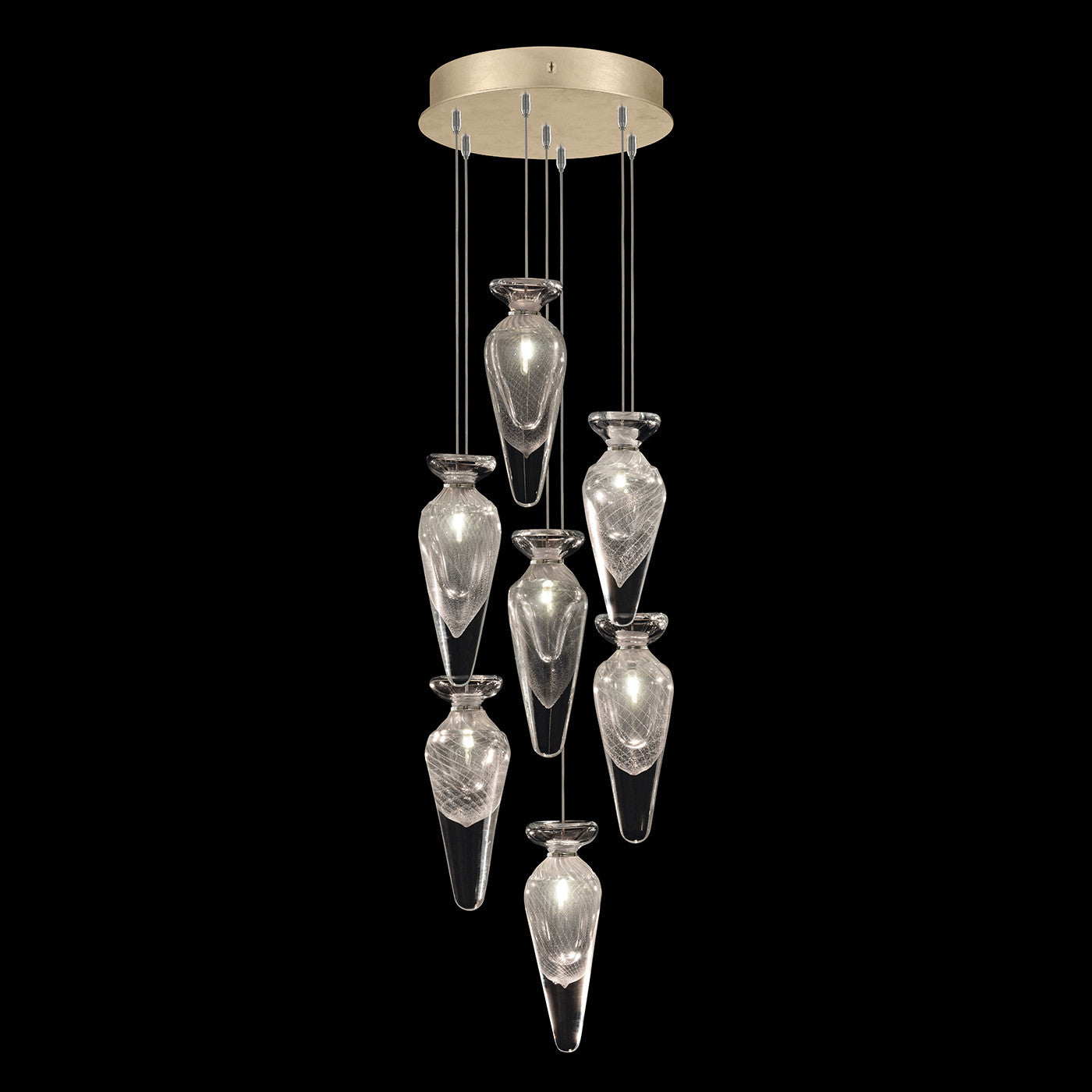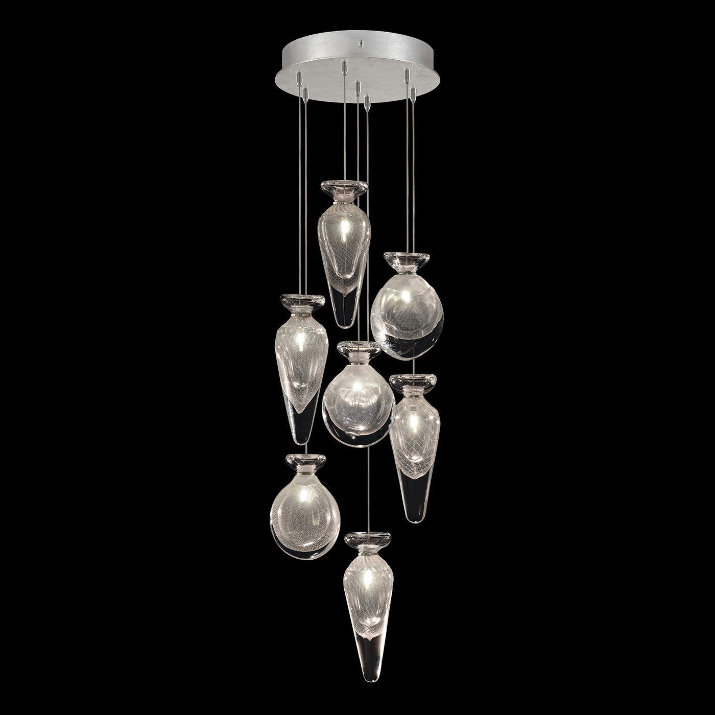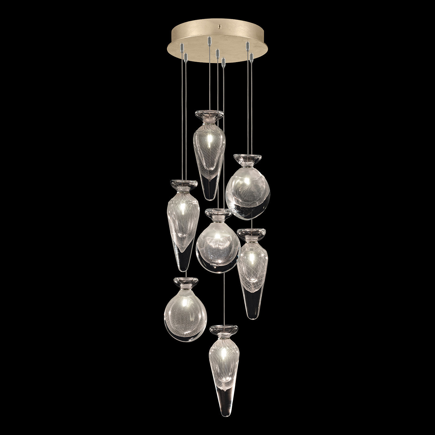 Adjustable pendant inspired from the timeless beauty of vintage scent bottles. Our skilled glass artists have masterfully captured the essence of lightning in a bottle, resulting in exquisite hand-blown designs. Available in standard silver leaf or standard soft gold leaf finish, and your choice of two hand-blown glass options in two different colors.