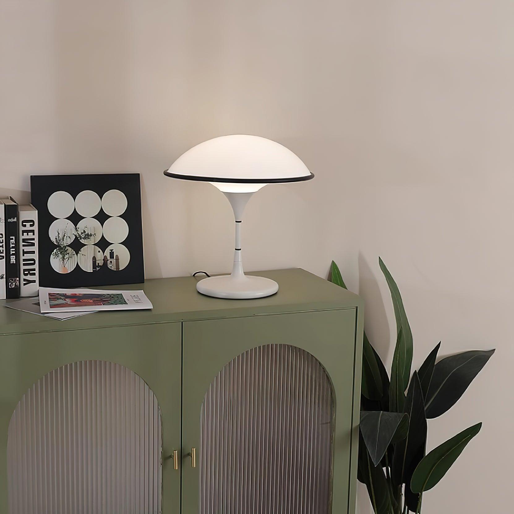 Its dome-shaped shade and sleek black trim pay homage to mid-century aesthetics while delivering a contemporary flair. The lamp's soft, ambient glow is perfect for creating a cozy atmosphere, making it an ideal choice for bedrooms, studies, or living areas. The slender, tapered stem with subtle black accents adds a touch of elegance and sophistication.?