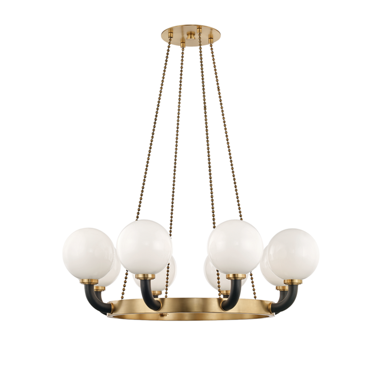 The simple silhouette of Sphere No.2 celebrates the universal beauty of the circle. Beautiful finishes covering half of the sphere and continuing at the bottom of the shade give the collection an approachable feel. Three-chain suspension from a robust canopy completes the timeless style of this attractive piece.
