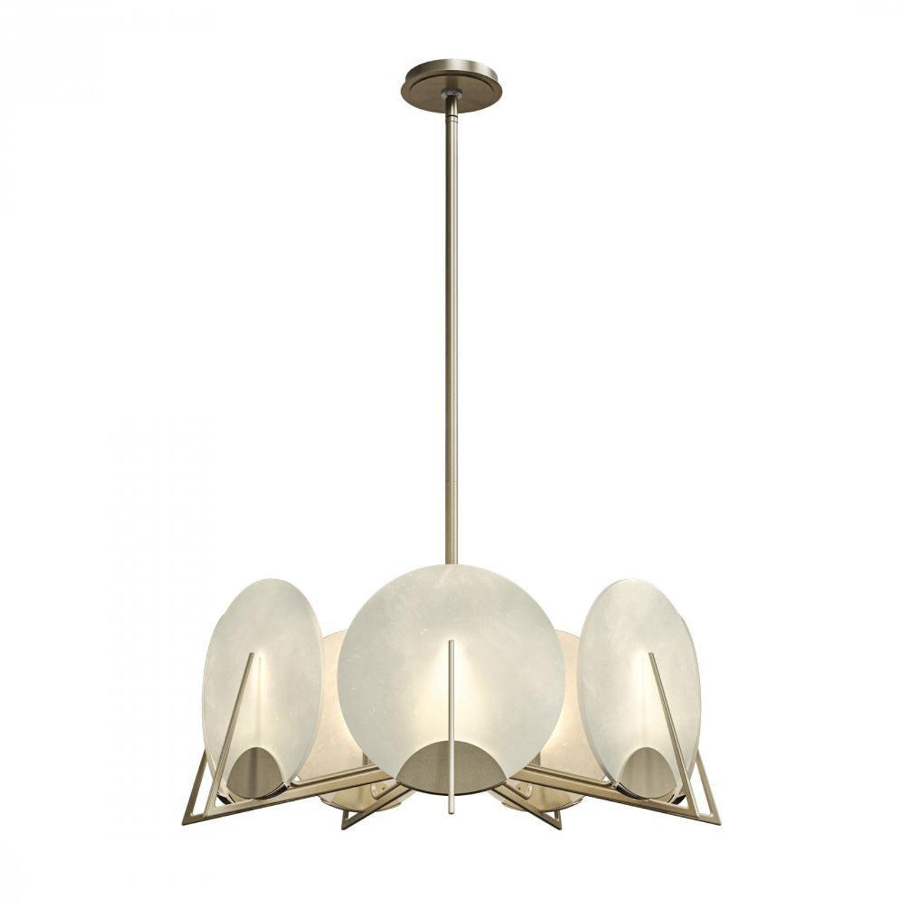 Immediately, you notice the beautiful Alabaster stone discs that vary organically in the Callisto 7-Light Pendant. Nestled in small demi-lune metal bases with spider-like metal tine stabilizers, this contemporary lighting fixture features a traditional alabaster, chosen by designer Ori Goldberg, that has a rich history of use for carving decorative artifacts.