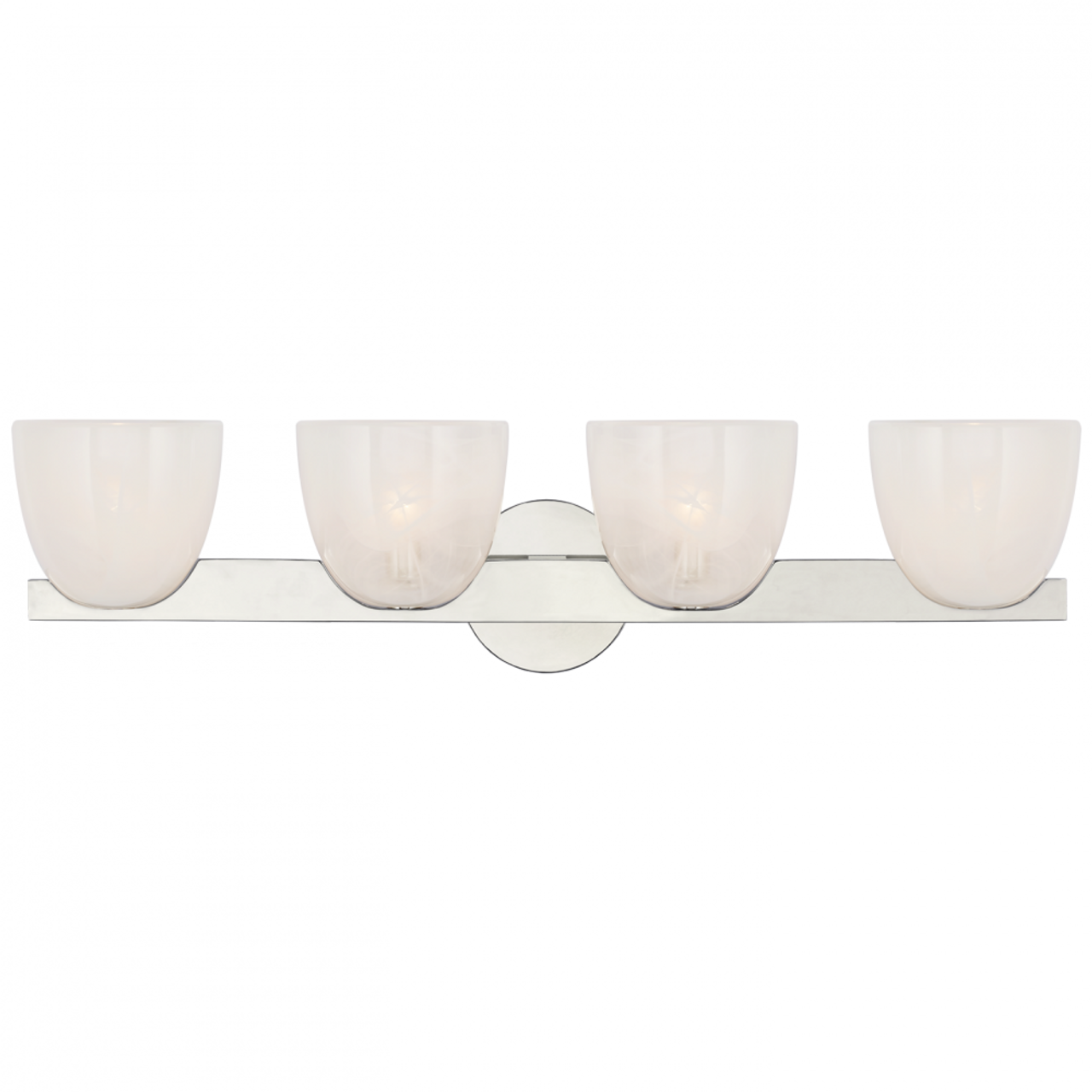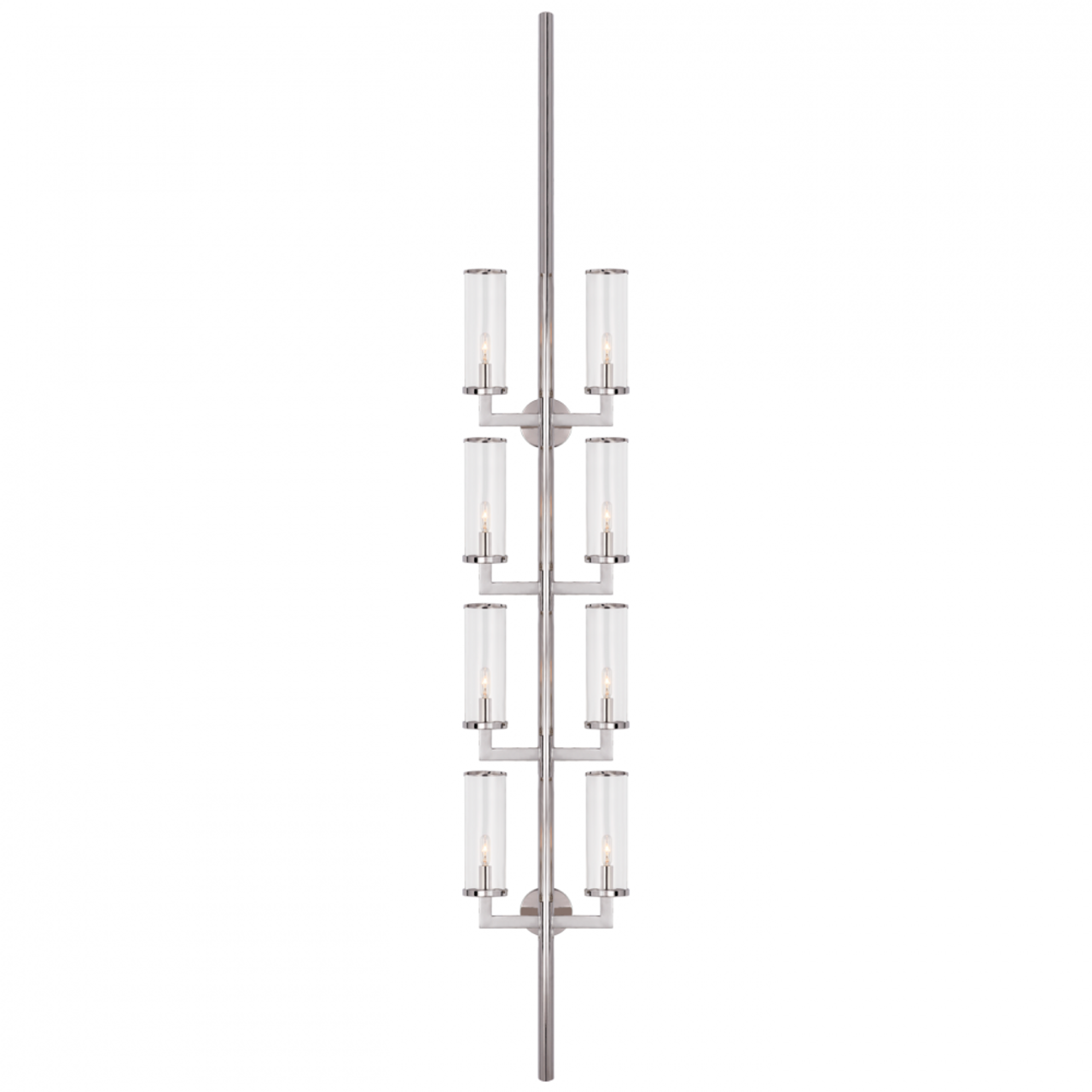 The mid-century modern Carola by AERIN presents a unique design with horizontal metalwork supporting upturned shades in clear, frosted or white stri茅 glass options. The series will add character and warm illumination to hallways or large rooms alike.