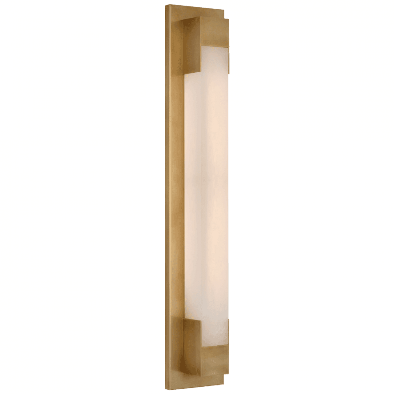 The Covet Bracketed LED Bath Wall Sconce from Visual Comfort Signature combines the elegance of natural alabaster with the strength of solid brass for striking bathroom lighting. Designed by Kelly Wearstler, this fixture showcases her architectural approach with bold contrasts and clean, linear forms. The integrated LED technology enhances the alabaster's unique patterns while offering efficient task lighting. The bracket design not only adds visual interest but also serves as a practical mounting solution. This sconce seamlessly blends functional lighting with artistic expression, elevating your bathroom routine with its sculptural presence and thoughtful illumination.