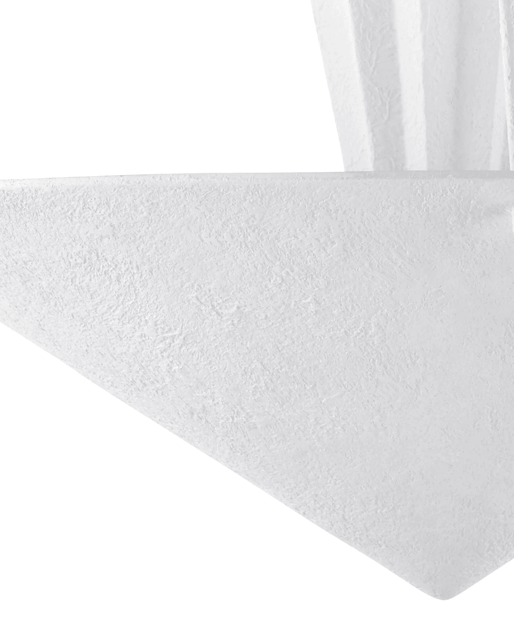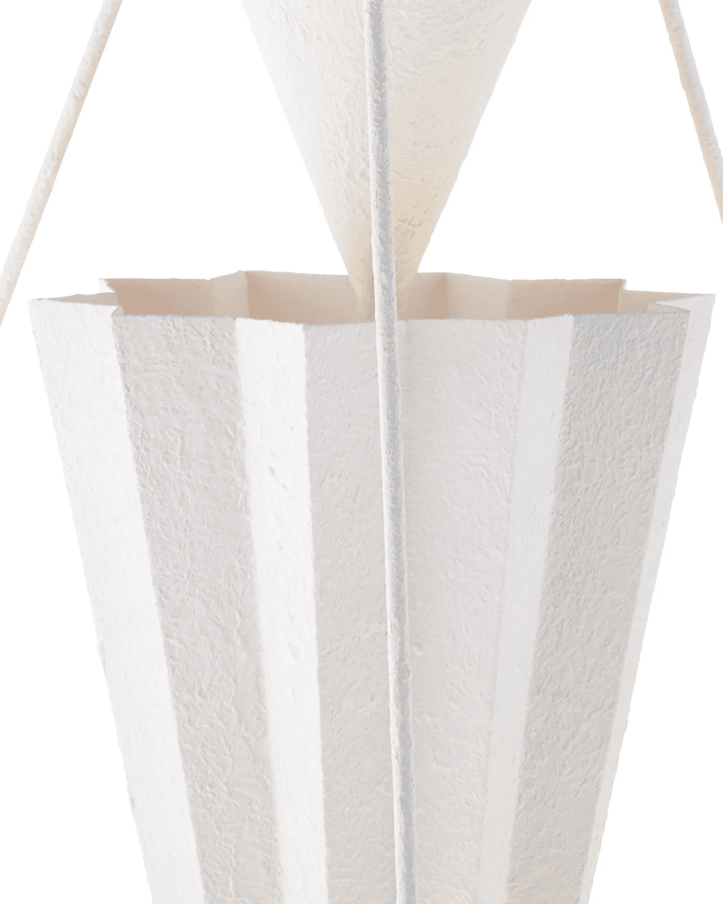 Playing with geometrical shapes that create tiers of up-light, the Empyrean Chandelier was designed with clean lines, making it as contemporary as designs come. The fluted shape of the middle shade is a design detail that brings added interest to the profile of this white chandelier. The wrought iron fixture is covered in a yeso blanco finish that creates a stippled effect to add a subtle tone-on-tone texture to the piece. Adjustable from 38.5" to 106.5" with use of included chain/rod kit/cable. If your space calls for a longer drop, additional chain/rods/cable is available for purchase.