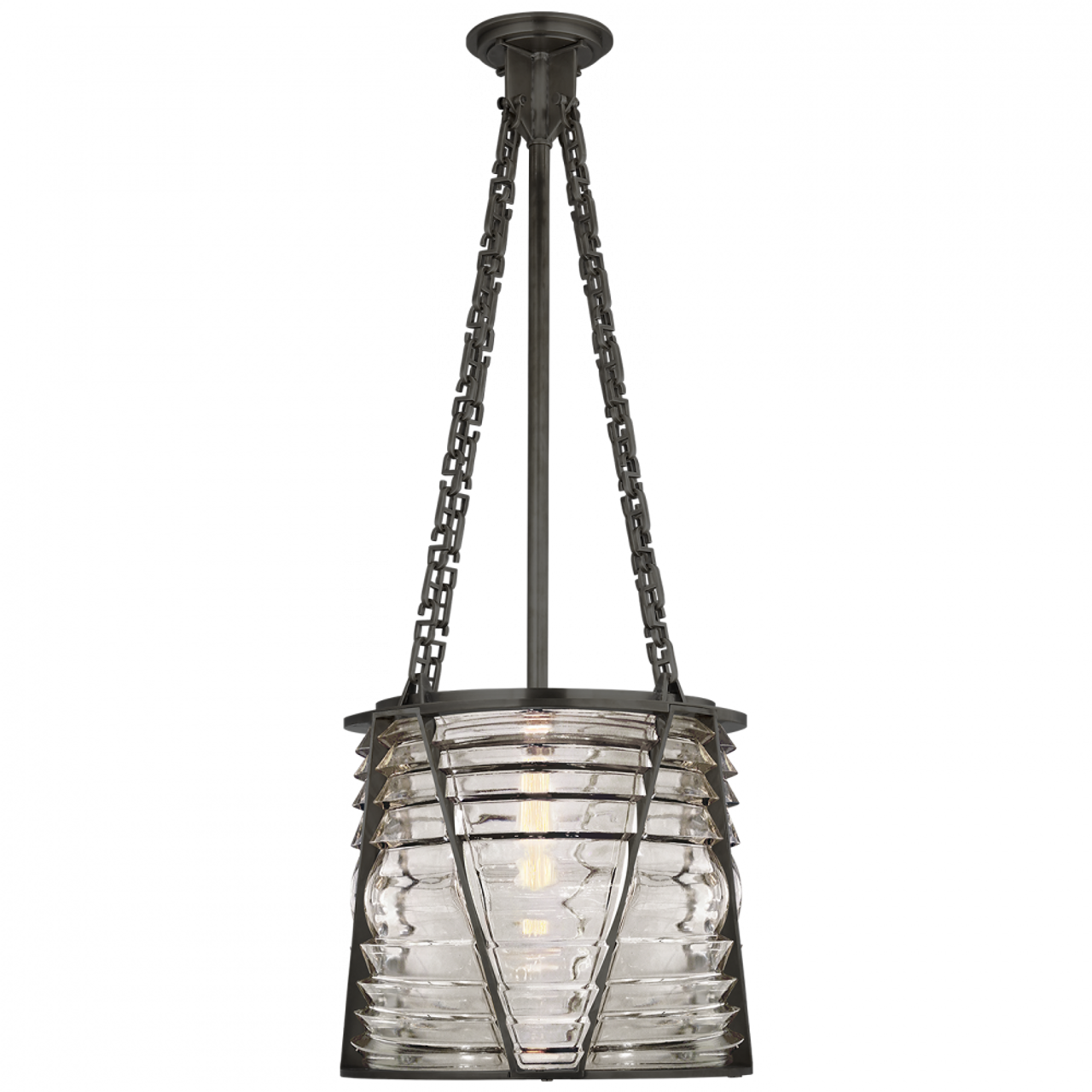 Unleash boundless creativity with the exquisite craftsmanship of the Falaise Pendant from Visual Comfort Signature. Reminiscent of a bygone era, this pendant, envisioned by Ralph Lauren, boasts a commanding brass construction that exudes vintage charm. Suspended from a gracefully contoured circular canopy by a single chain, it elegantly showcases a candelabra lamp in brass beneath a towering glasshouse-style shade, complemented by clear glass panes. The translucent shade diffuses a soft luminosity emanating from the open candelabra lamping, enveloping the surroundings in a harmonious blend of gentle radiance to the sides and a broad wash of light below.