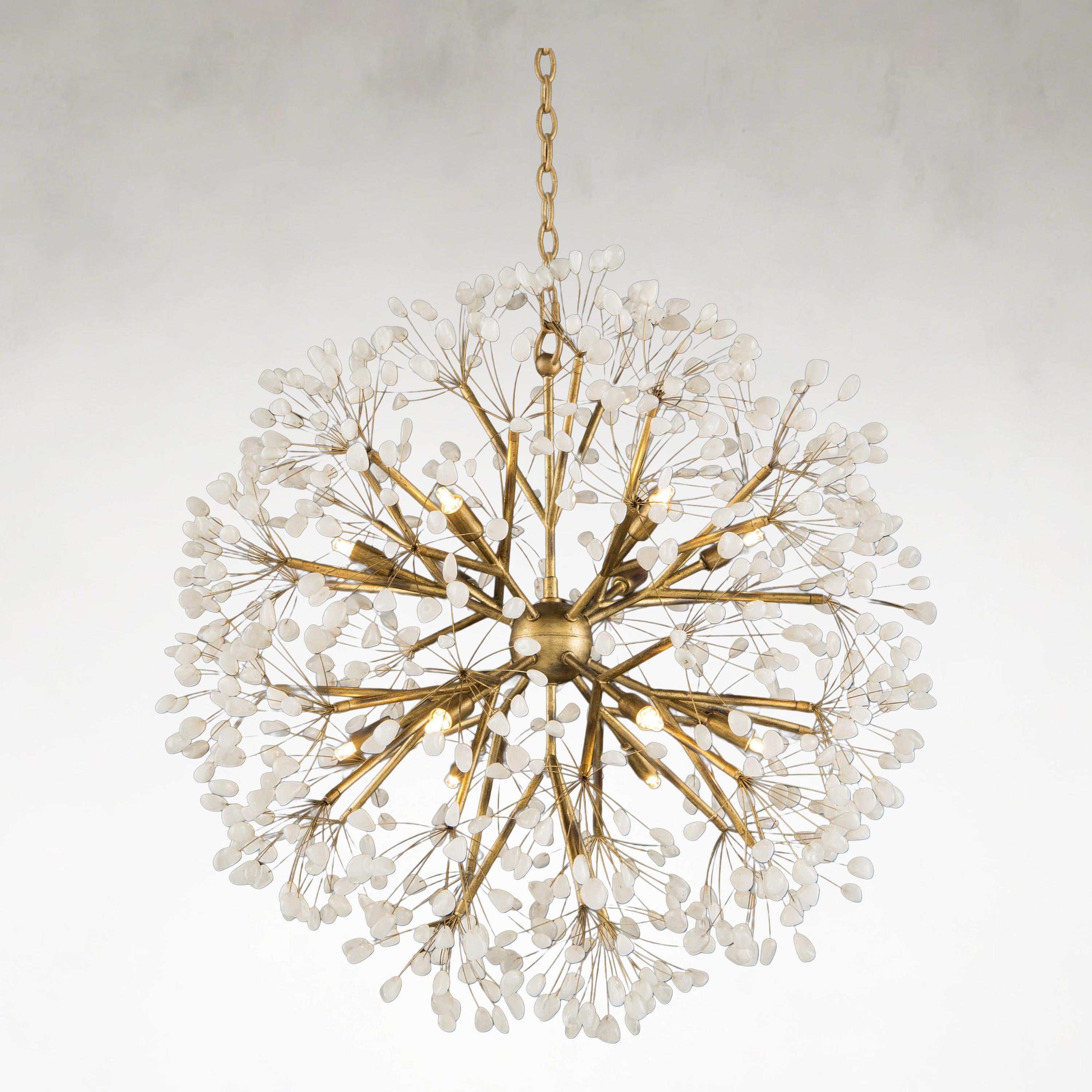 Meta Description A spherical twelve-light quartz pendant chandelier featuring metal and iron construction. Ideal for boutique restaurants, hotel homestays, and artistic interior spaces.