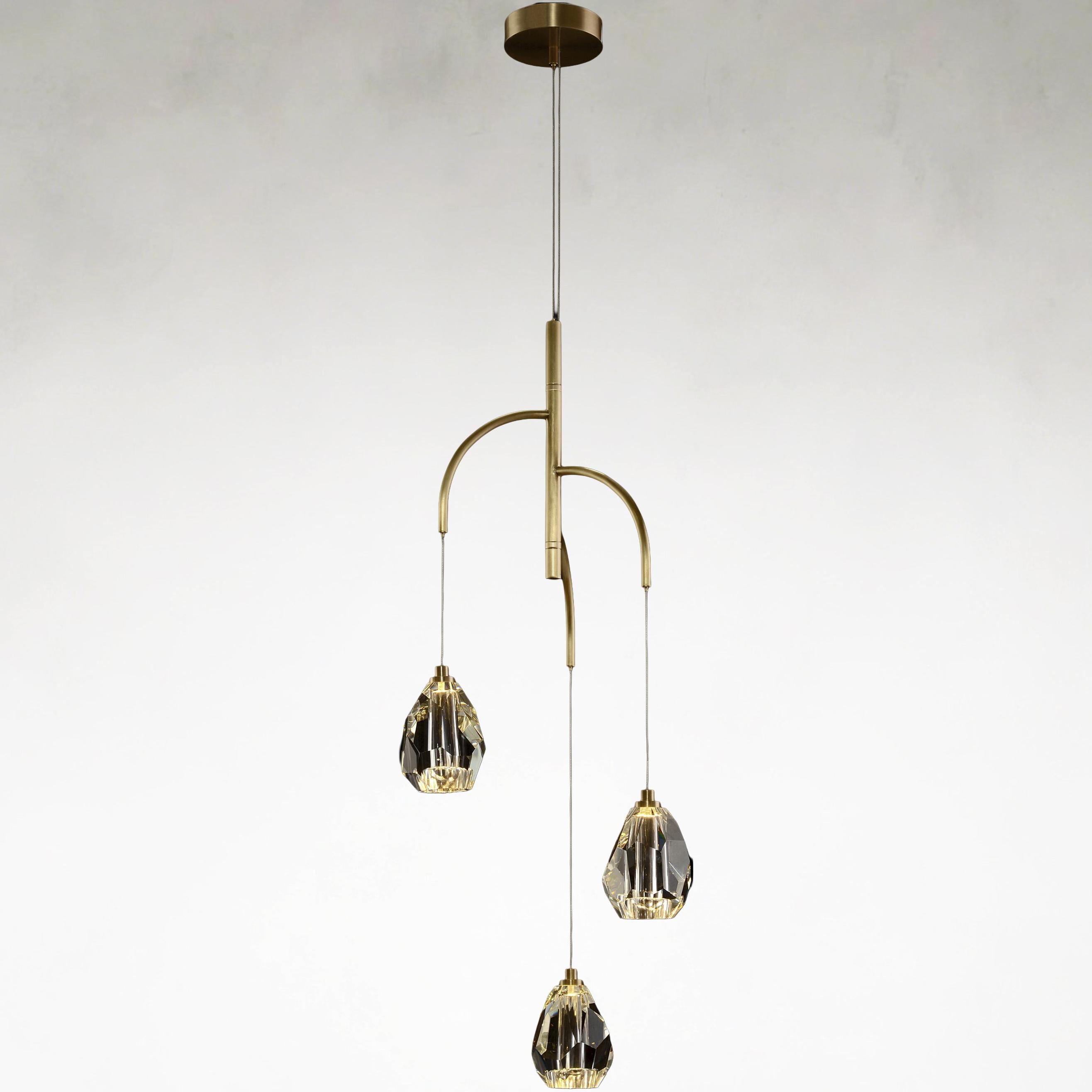 Meta Description A faceted chunk crystal three-light chandelier featuring sculpted metal and brass details. Ideal for boutique dining rooms, hotel suites, and expressive interior spaces.