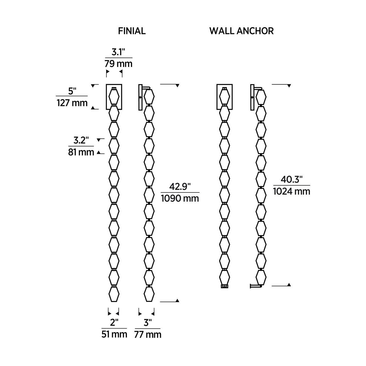 • Dimensions: 40.3"H x 3.1"L x 3"W