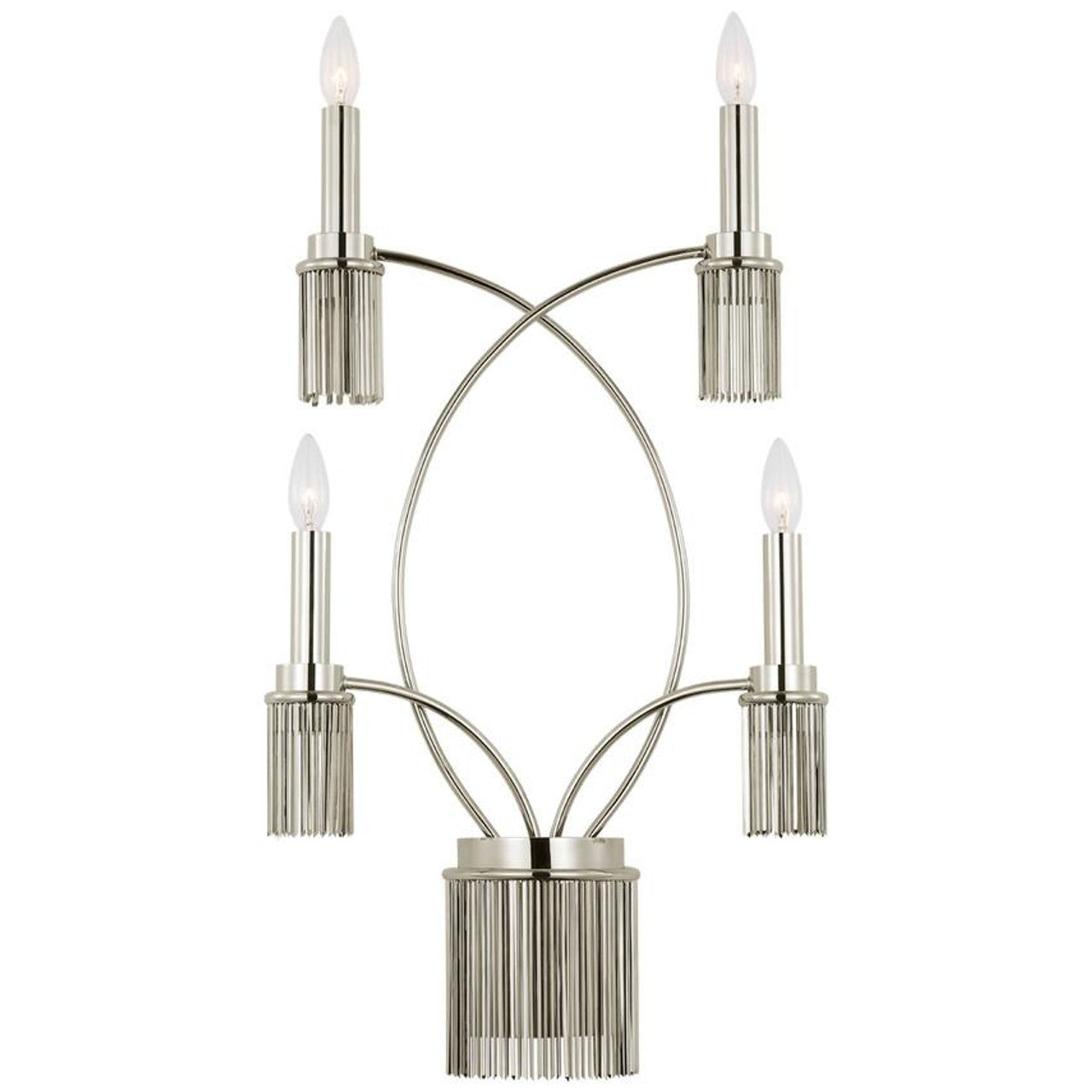 The Sutton 4-Light Wall Sconce brings elegant drama to your space. Curved arms with candle holders are paired with cascading metallic fringe, reflecting bold shadows. Designed by Fisher Weisman, this piece combines vintage-inspired details with modern flair. Ideal for hallways, dining rooms, and living spaces, it adds both dimension and theatrical style to any room.