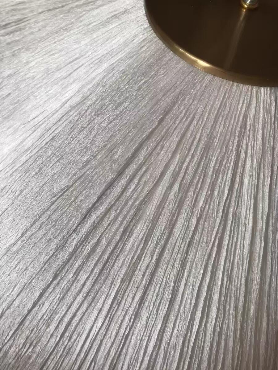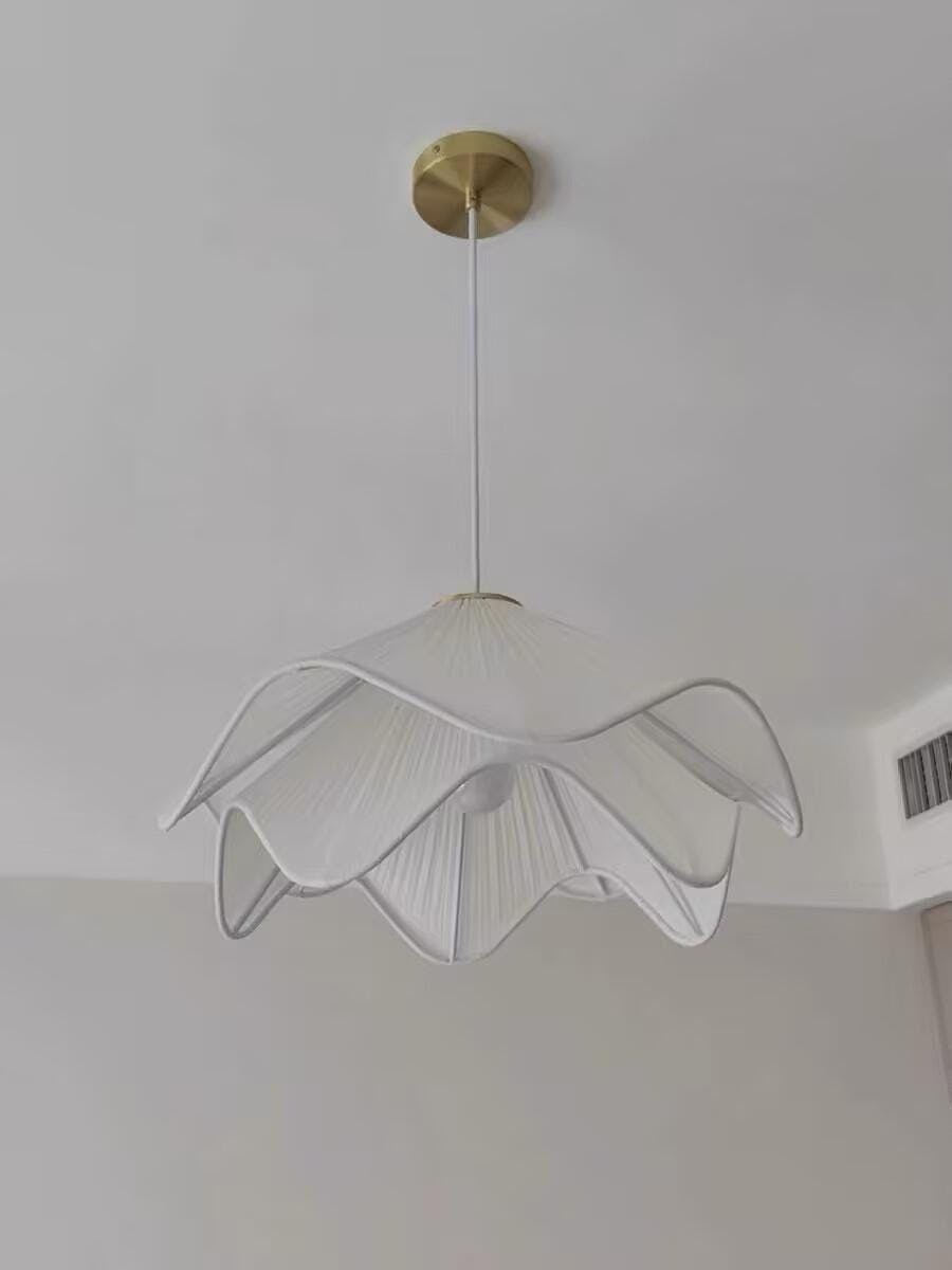 The Ethereal Bloom Pendant Light is an elegant and graceful suspension piece featuring multiple layers of light white fabric with delicate pleats, creating an energetic appearance reminiscent of blooming flowers or swirling skirts. Soft light diffuses through the layered shades, accentuating the gleaming brass hardware of the pendant. This delicate look will float beautifully above dining tables, living rooms, or bedrooms.