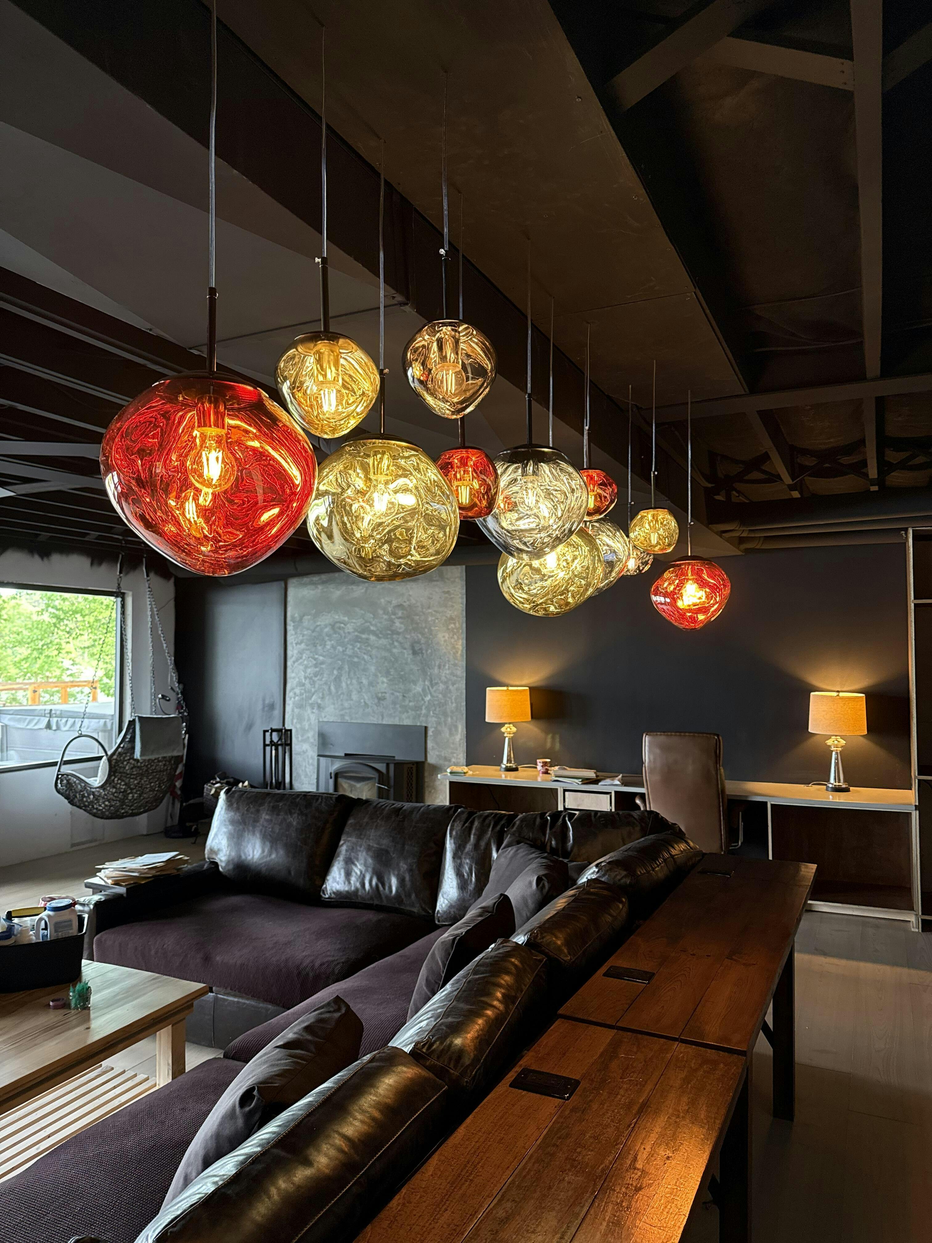 This Modern Lava Pendant Lamp features a twisted copper-clad ceiling rose paired with an intricate design. When illuminated, its eye-catching, mild psychedelic glow creates an entrancing molten-hot glass effect. The light also has a mirror-effect when switched off. Available in copper, chrome and gold finishes. An ideal choice for creating a unique, ambient atmosphere.