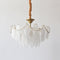 Make a bold statement with this Texture Glass Leaf Chandelier. Its unique feather shape and wrought iron lines and circles offer style and depth, while the leaves texture glass lampshade provides non-glaring light. Perfect for any daring space!