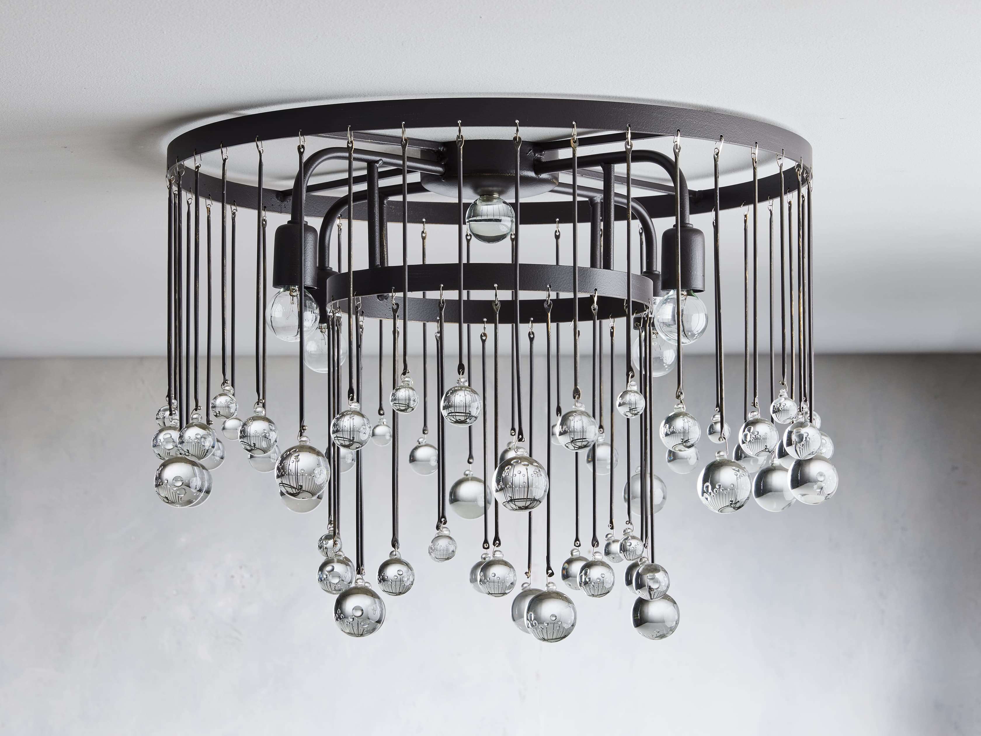 Equally at home in an ancient French castle or a downtown New Orleans loft, our Aubrey Flushmount creates dramatic ambiance in any setting. Crystal drops hanging in varying lengths from an iron cage create the illusion of movement as they catch the light, refracting brilliant beams around your room.