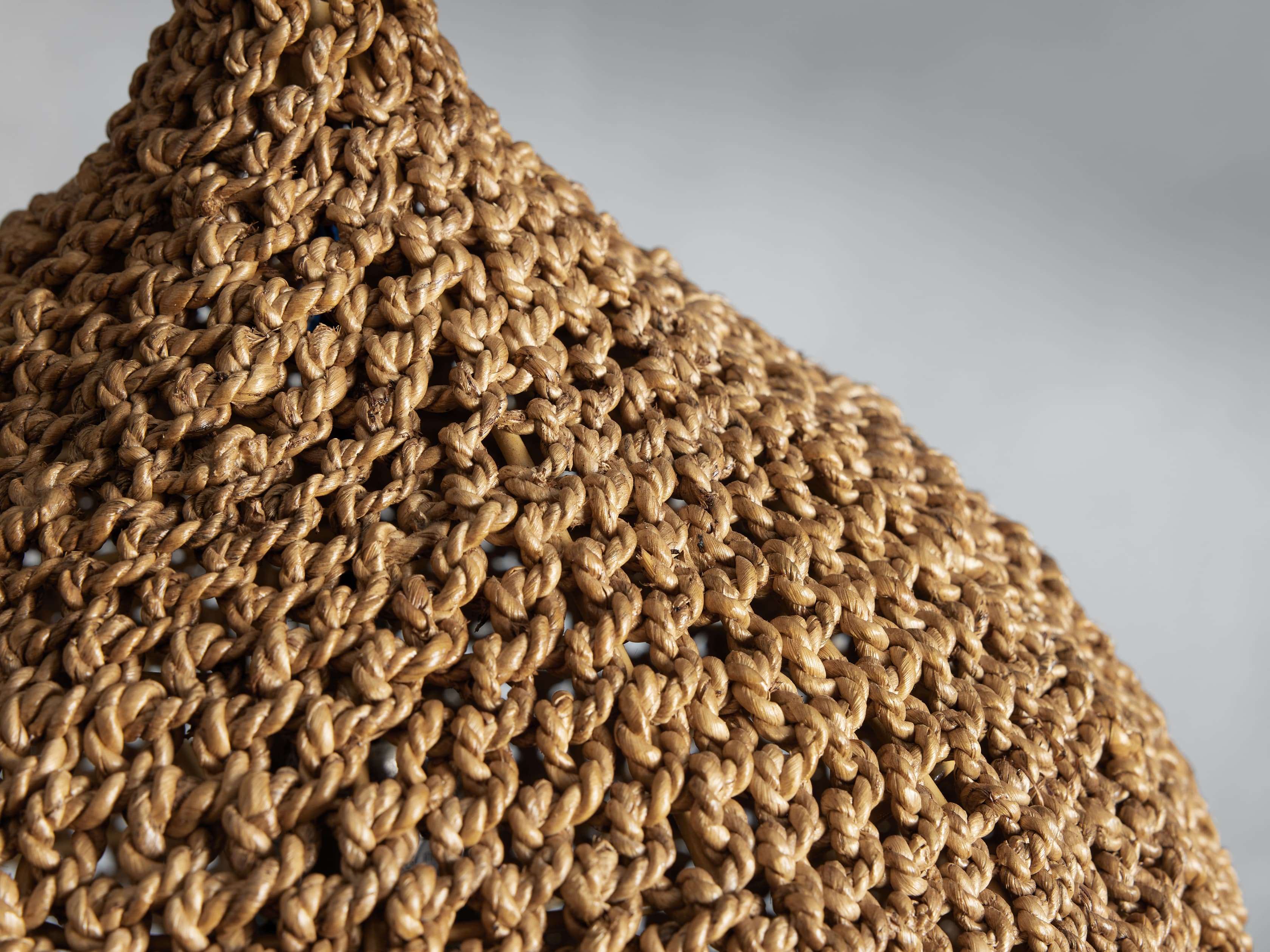 • Crafted from handwoven natural banana rope wrapped around a metal frame with a plated brass canopy.