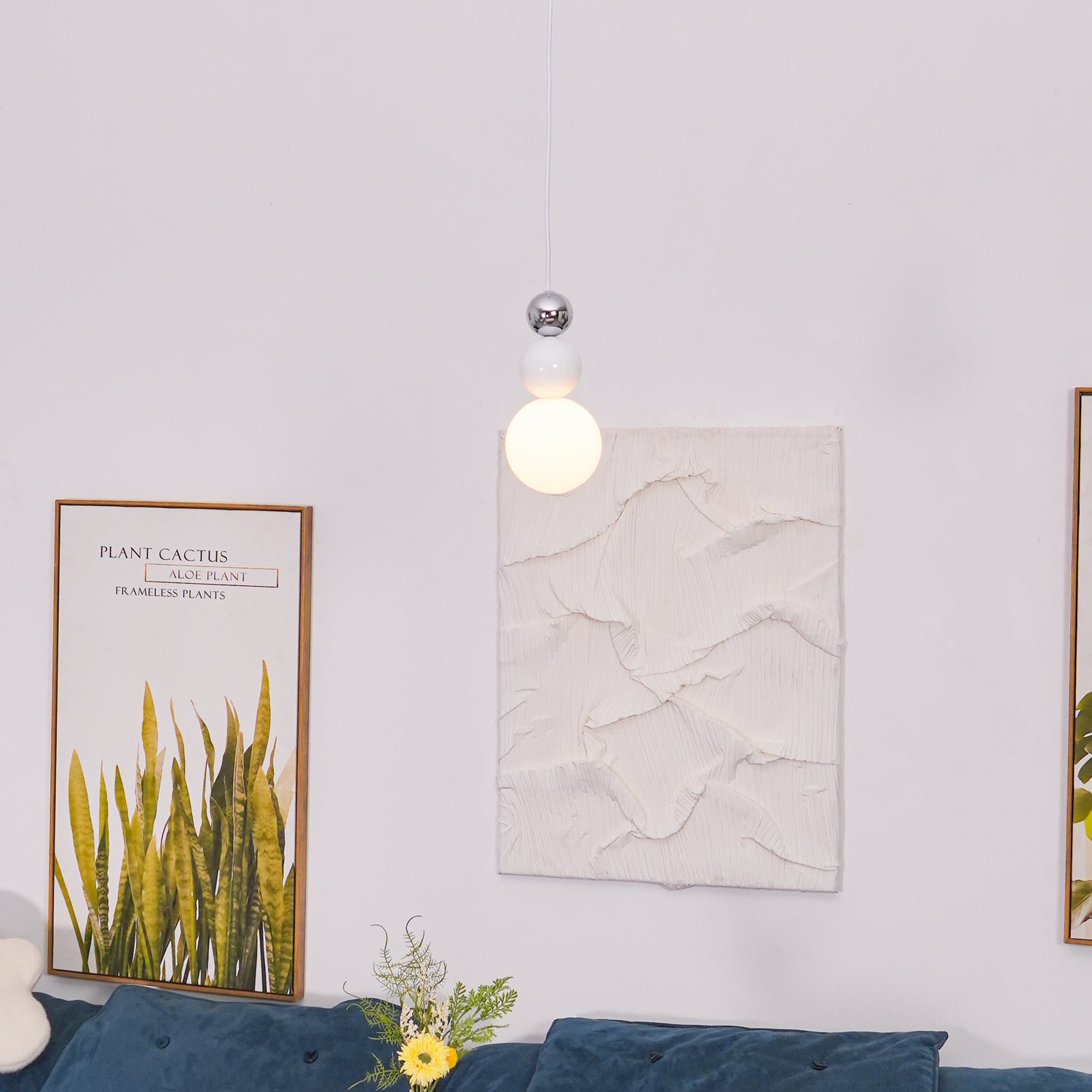 Each pendant light consists of a metal body and acrylic lampshade. The metal body is durable and showcases a sleek surface finish, adding a touch of modernity and texture. The white acrylic spheres allow the light to pass through, emitting a soft and warm glow, creating captivating light and shadow effects.