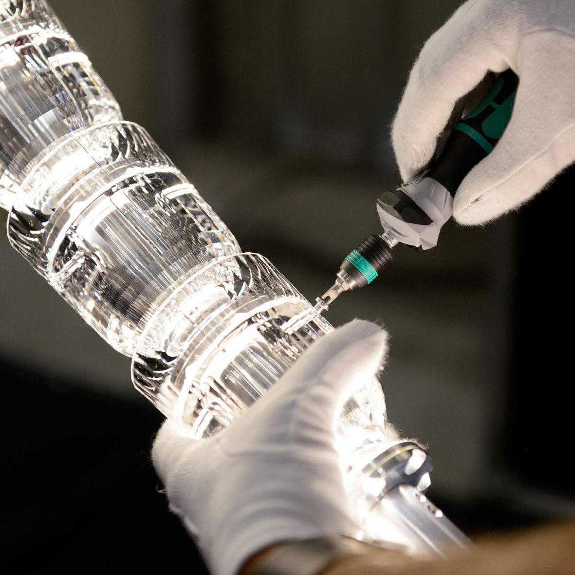 Gabriel Chandelier B's design is directly inspired by the elegant form of a snake from above. It features a carefully wound spiral structure that creates the illusion of an elegantly moving snake. The shape and position of each section has been precisely designed to capture the serpentine and smooth nature of the snake's body, drawing the eye with vertical elegance. The strategic placement of lighting within these sections casts a purposeful glow that enhances the chandelier's hypnotic and dynamic silhouette, making it a profound statement for any high-ceiling space seeking to express wildness in refined sculptural form.