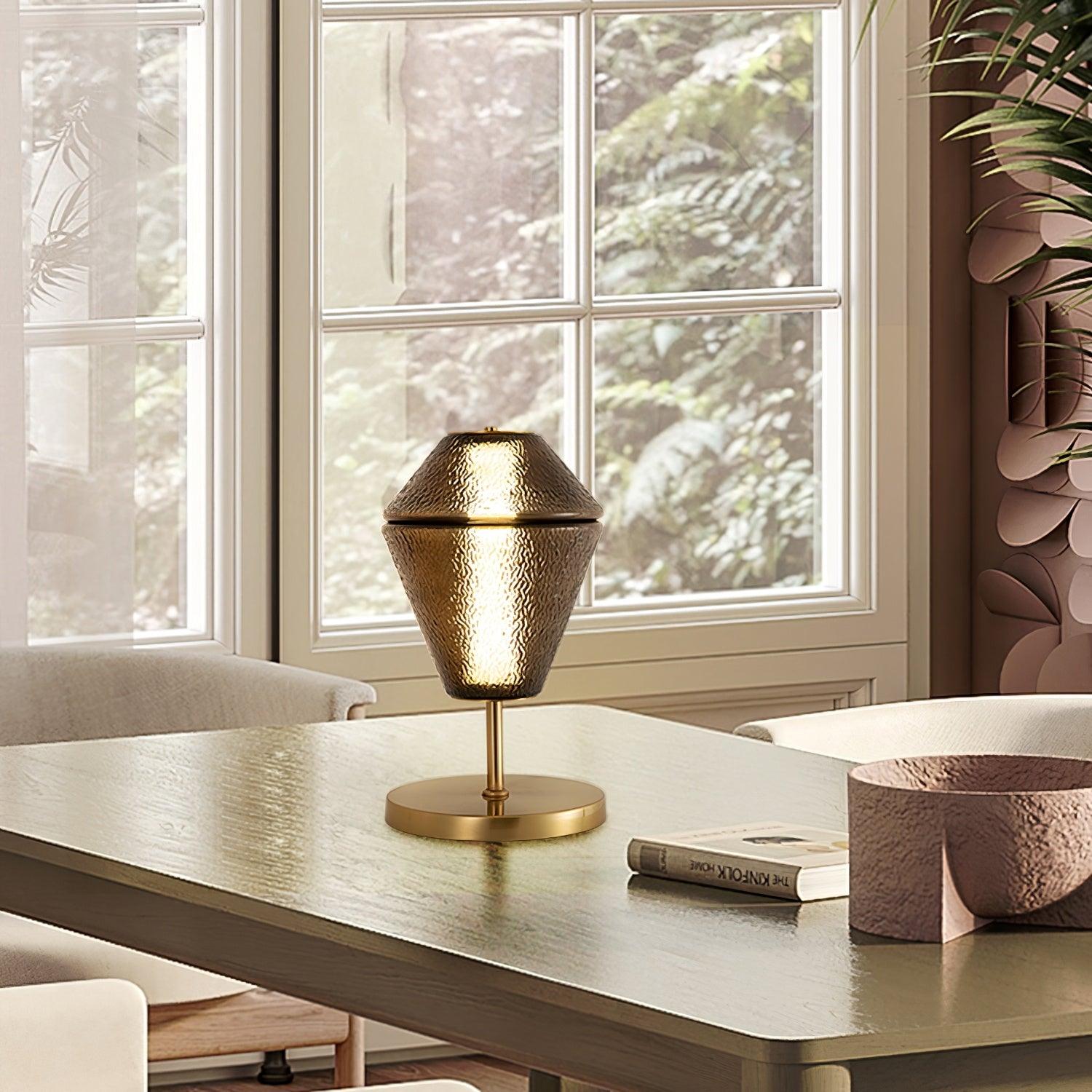 Our Totem Glass Table Lamp combines a classic with contemporary through the lamp's beautiful gold base and ribbed glass shade. is a uniquely stylish piece.