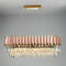 Expertly crafted with handmade crystals and stainless steel, the Gio 39" Rose Gold Dining Room Chandelier adds elegance and sophistication to any dining space. The combination of high-quality materials results in a stunning and durable piece that will elevate the ambiance of your dining room.