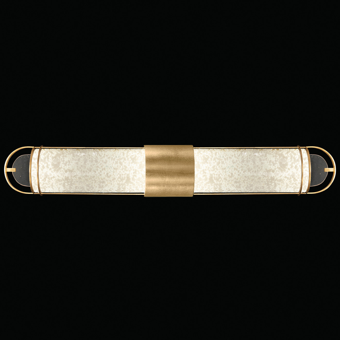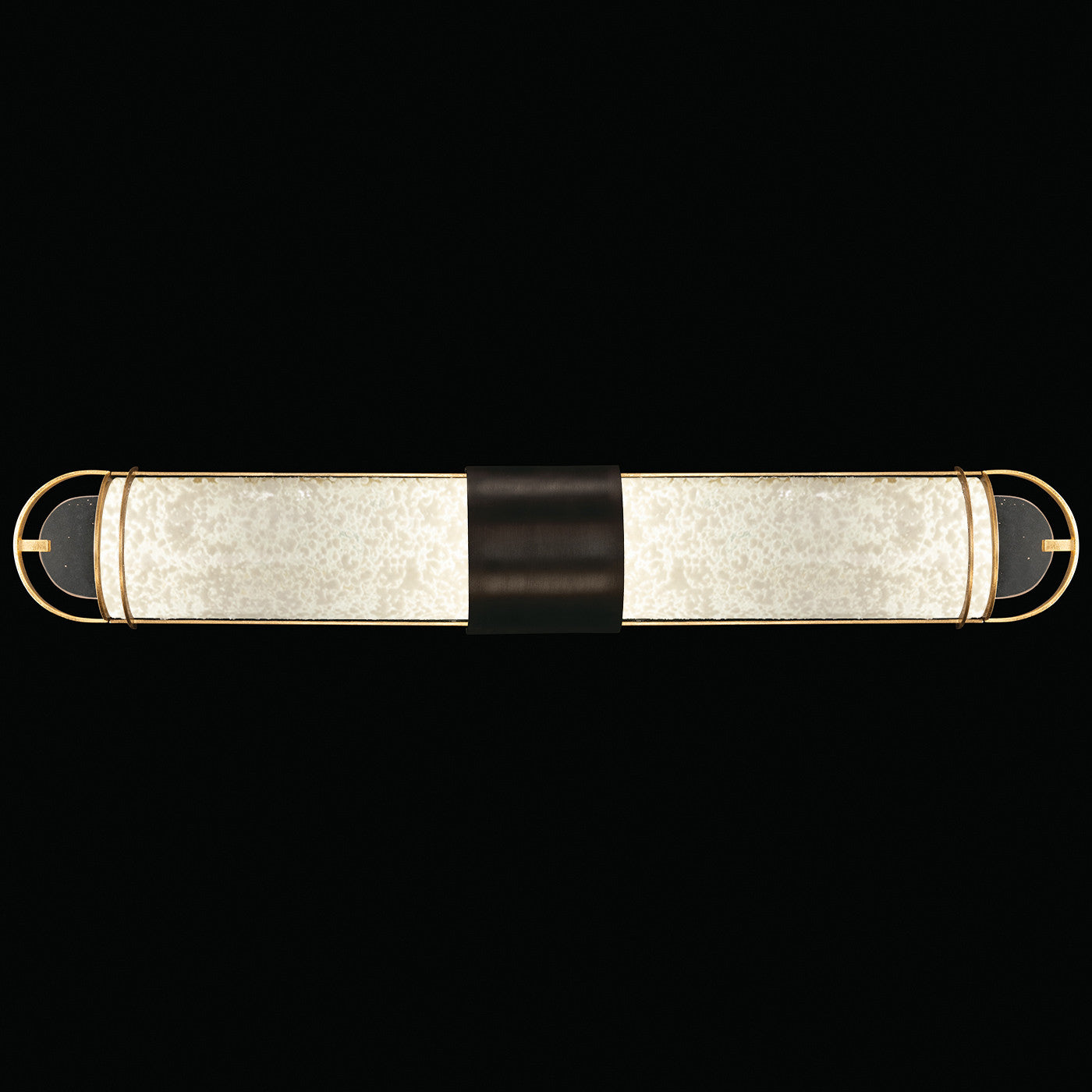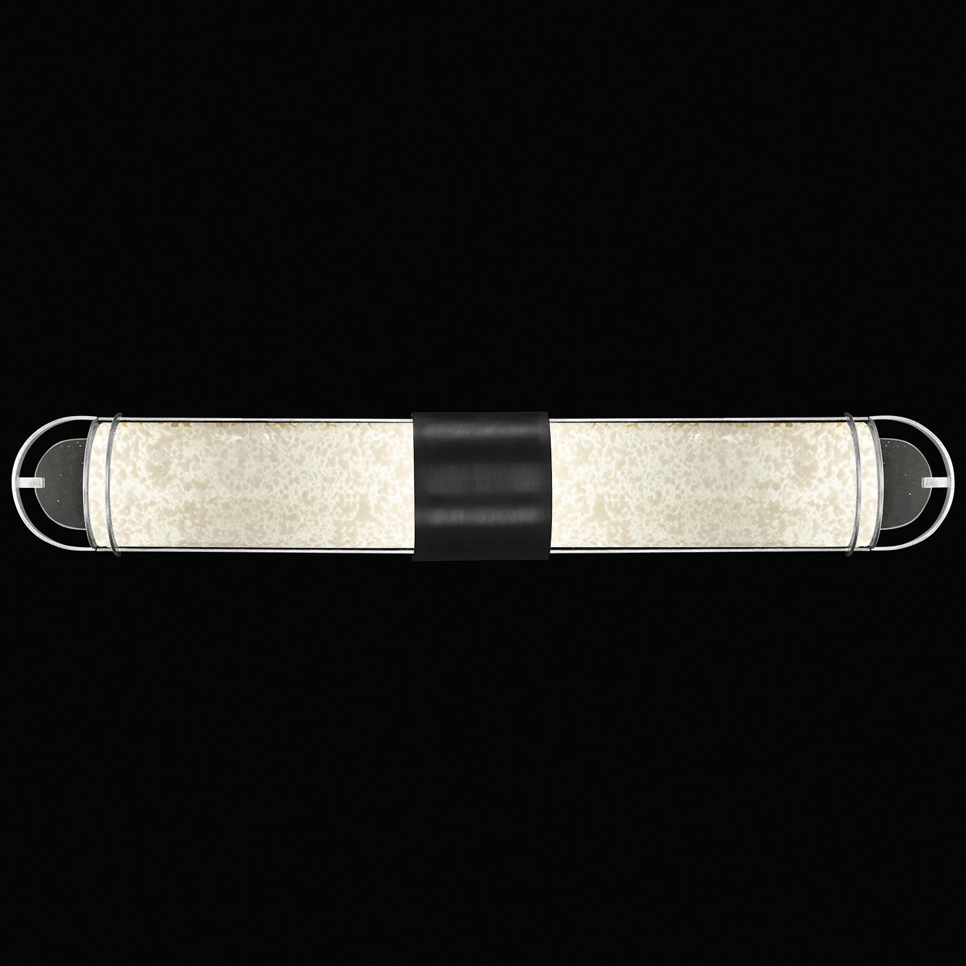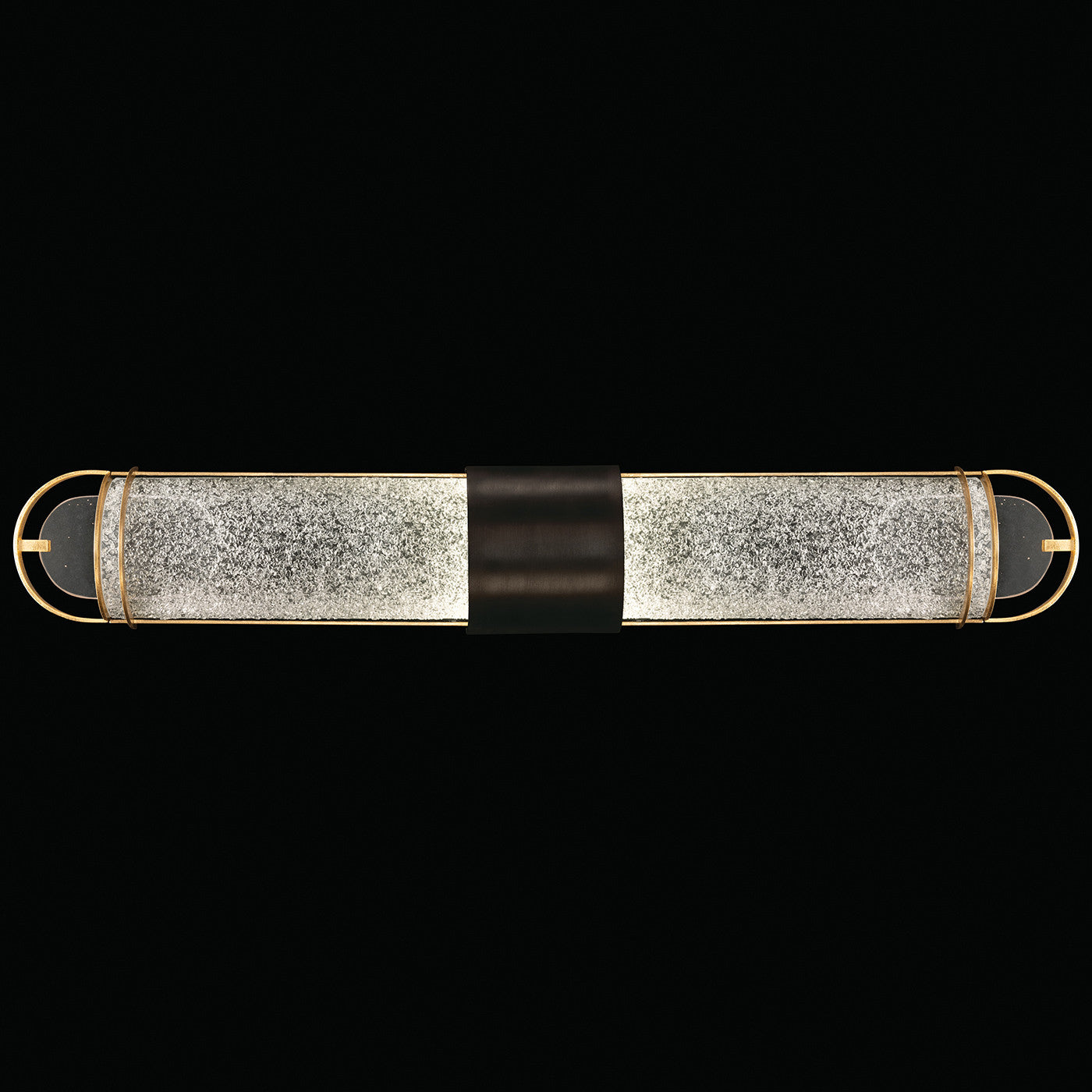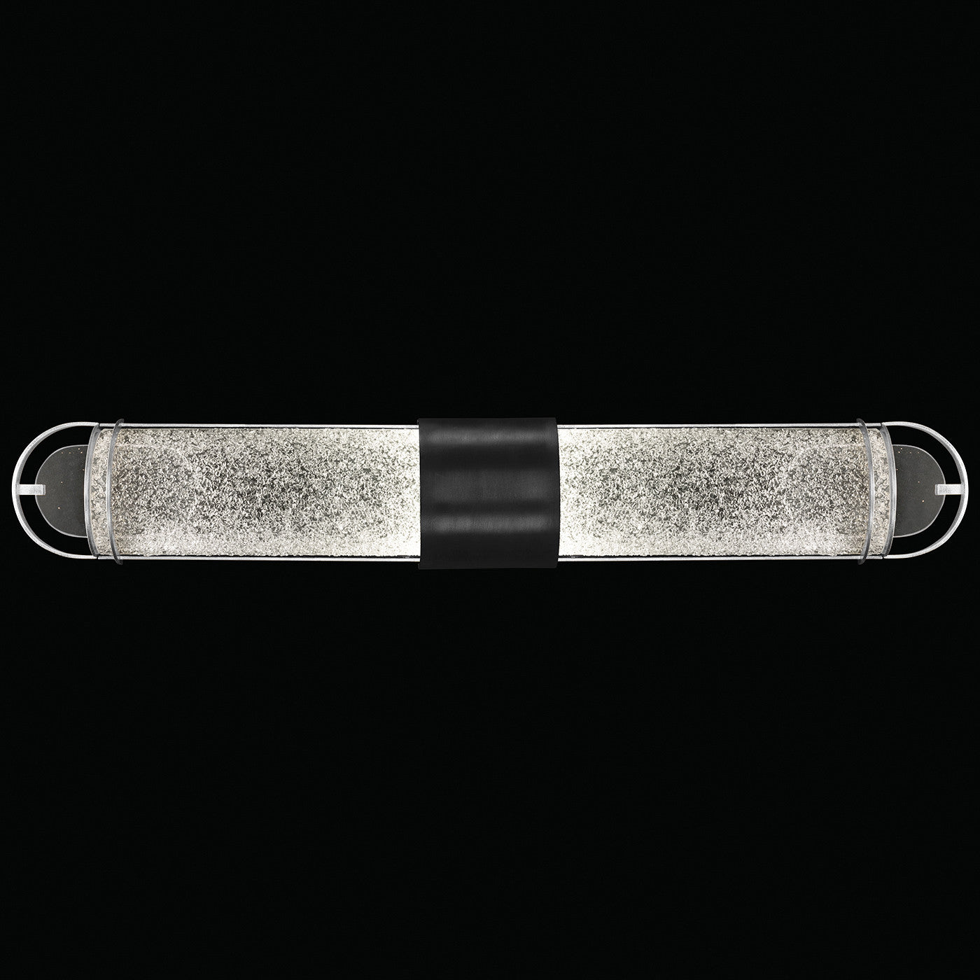 Luxury LED bath fixture featuring illuminated cylinders formed by handcrafted glass set within a silhouette, beautifully lit from within, spanning space vertically or horizontally. Available in Black & Silver, Black & Gold, Gold and Silver finish with either Diamond Blanket Glass or Bahama Sand Glass.