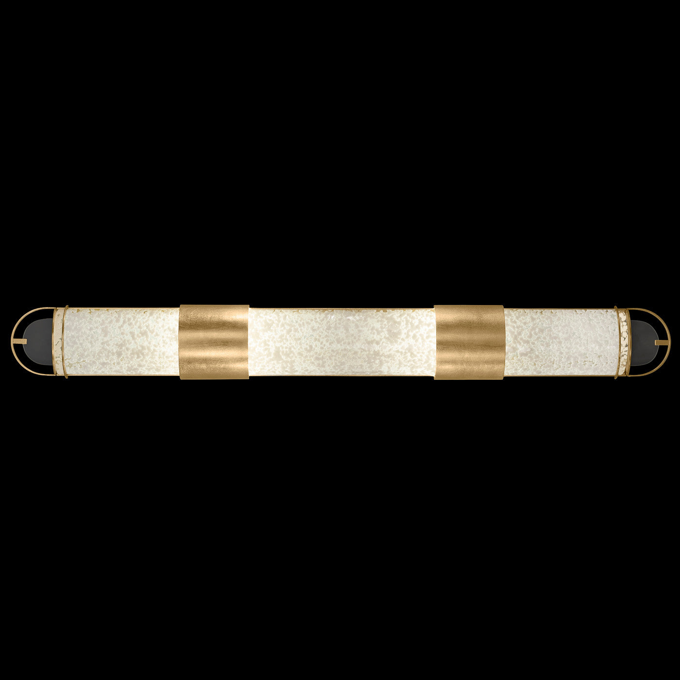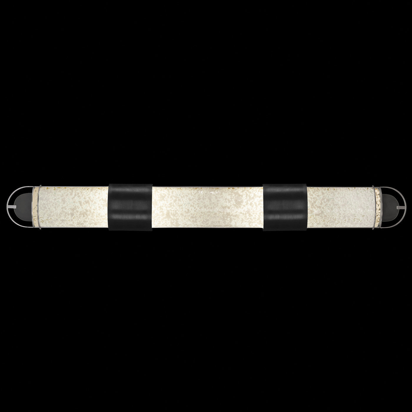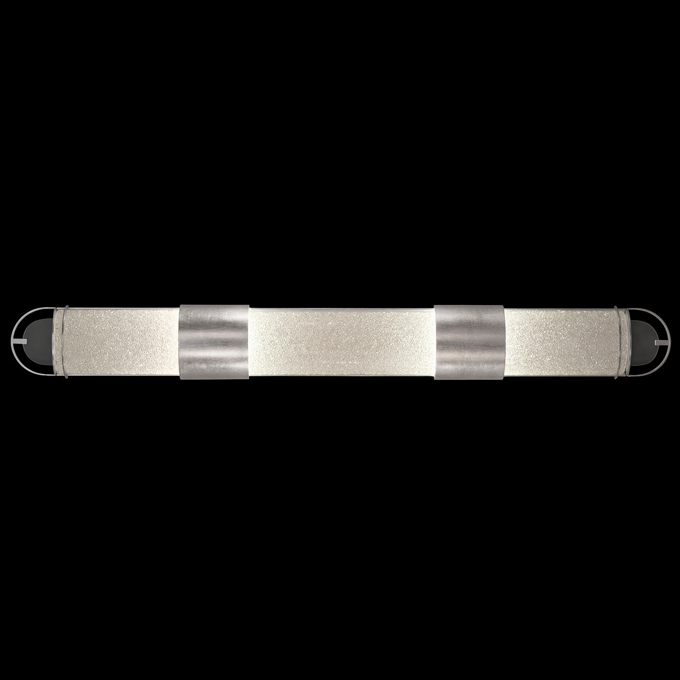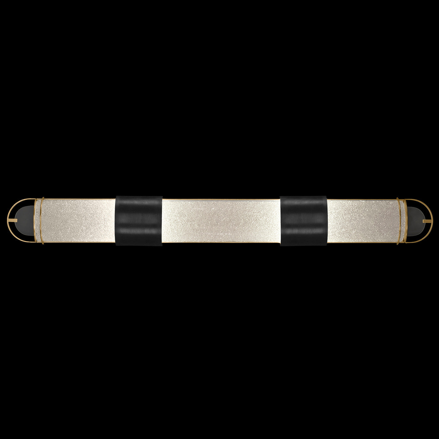 Luxury LED bath fixture featuring illuminated cylinders formed by handcrafted glass set within a silhouette, beautifully lit from within, spanning space vertically or horizontally. Available in Black & Silver, Black & Gold, Gold and Silver finish with either Diamond Blanket Glass or Bahama Sand Glass.