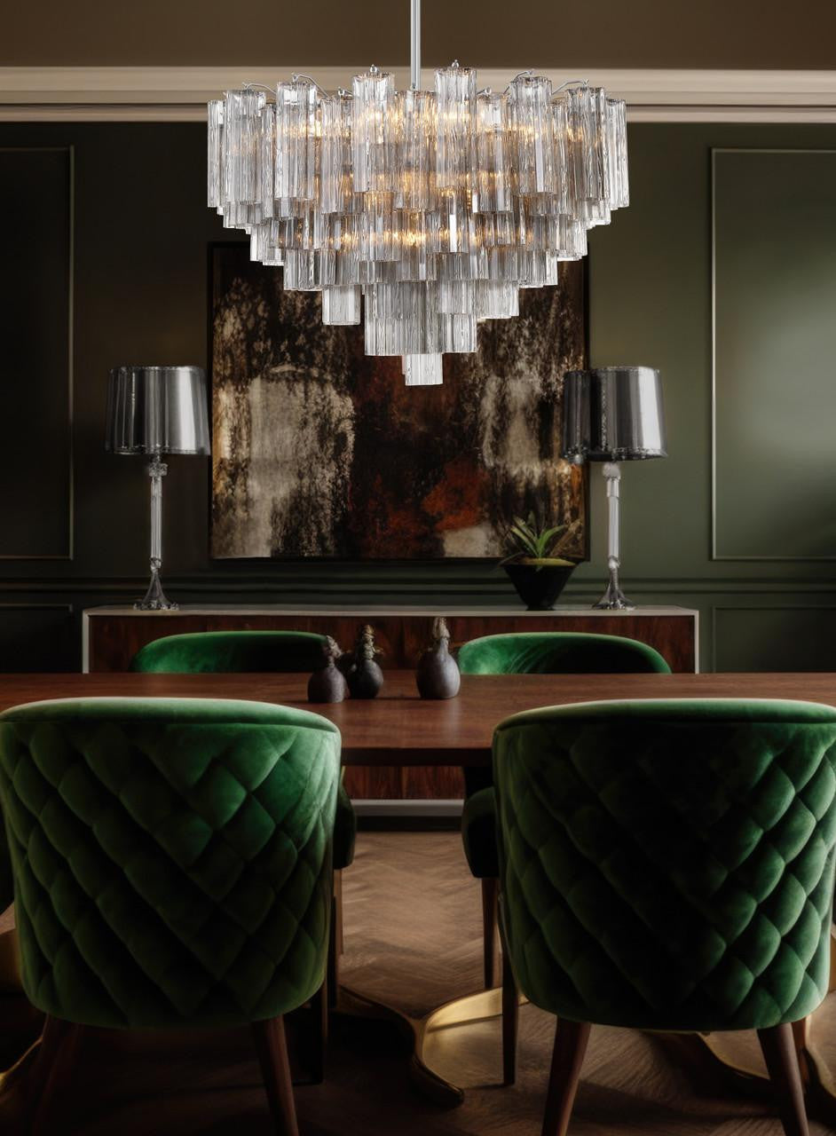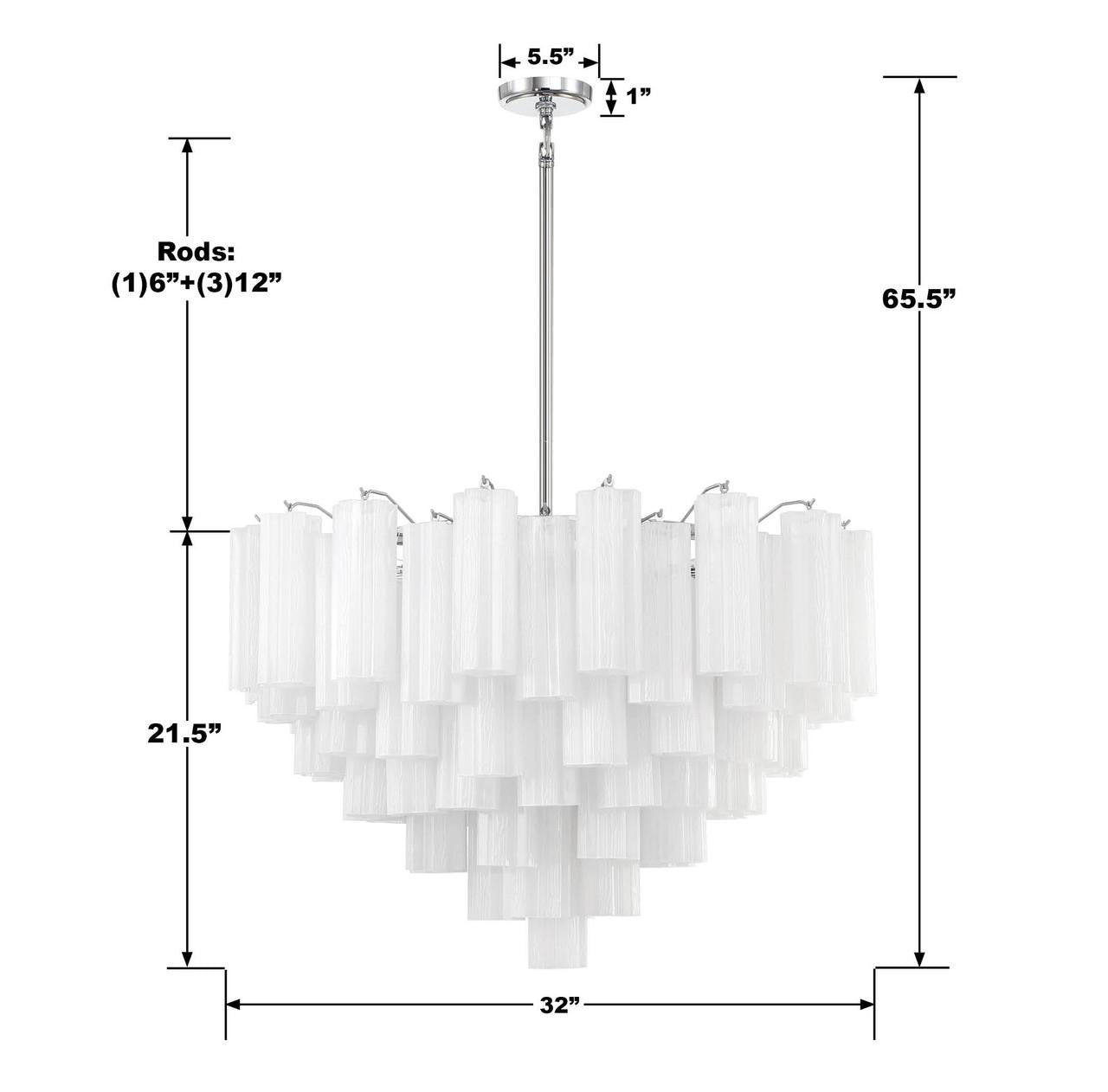 The captivating Addis Lighting Collection is a modern-day interpretation of the iconic mid-century Tronchi chandelier. Inspired by its predecessor's sleek lines and geometric shapes, the Addis features a polished Chrome or Aged Brass metal frame that exudes sophistication and style. Its unique design showcases transparent tiers of textured Tronchi glass tubes, forming a mesmerizing 5-point rounded star shape. Choose from a range of glass colors, including clear, amber, smoke, and white, or the stunning Autumn option, which features a captivating multicolor disposition of amber, clear, and smoke Tronchi glass. The Addis Lighting Collection offers various sizes and finishes, allowing you to find the perfect fit for your space while adding a touch of timeless elegance.