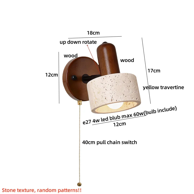 Yellow Travertine LED Wall Lights with Pull Chain Switch, Modern Rotate Bedside Lamp
