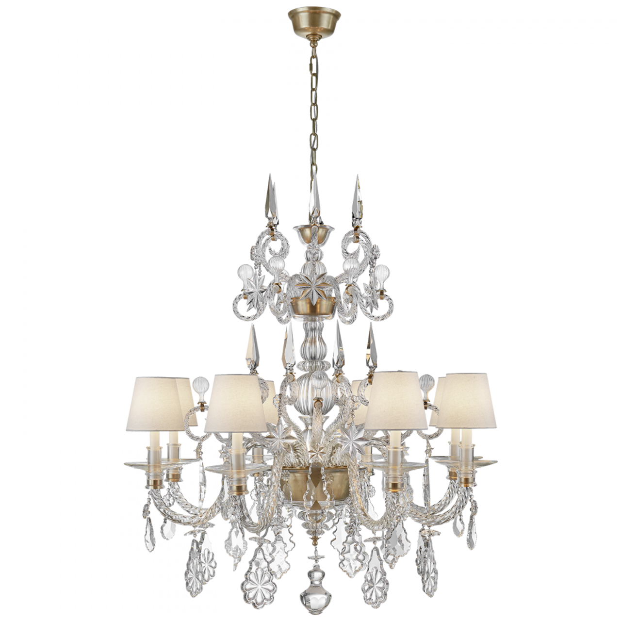 The Parisian Louis XV-inspired Alexandra by Ralph Lauren is a breathtaking chandelier. Scalloped metal and cut glass showcase oversized crystal drops in various shapes and sizes and feature linen shades. The elegant line will embellish an entryway or any room where guests gather.