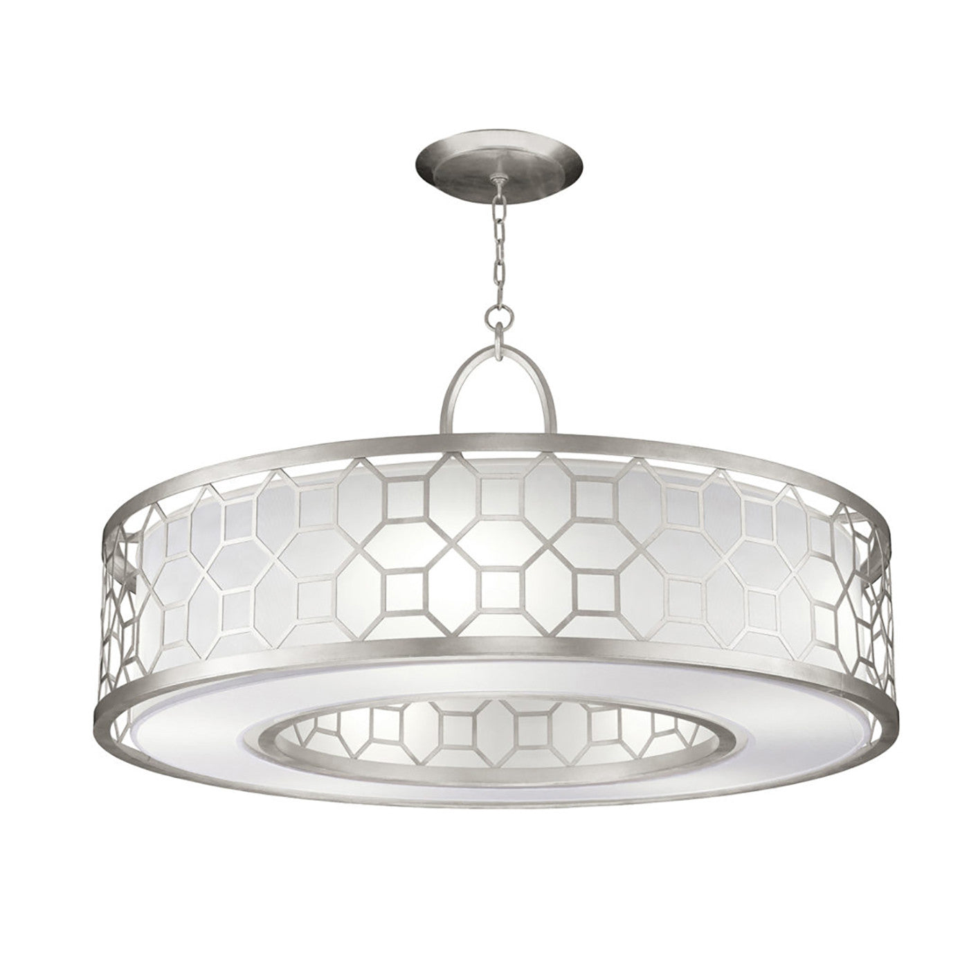 Pendant with fabric inner shade. Available in Gold finish with White Linen Shade, Gold Leaf finish with Champagne fabric shade, Silver finish with White Linen Shade and Silver Leaf finish with White fabric shade.