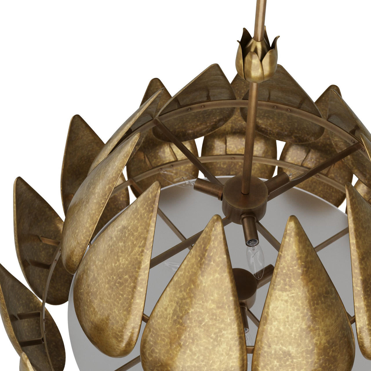This hammered chandelier of vintage brass is both bold and Brutalist in form. Two layers of Lotus petals suspended from a sturdy support encircle a frosted acrylic diffuser, allowing just the right amount of light to peek through for illumination. A vintage brass floral finial provides an extra detail on the centered pipe. Damp-rated, although limited covered outdoor conditions may affect finish. Finish will vary.