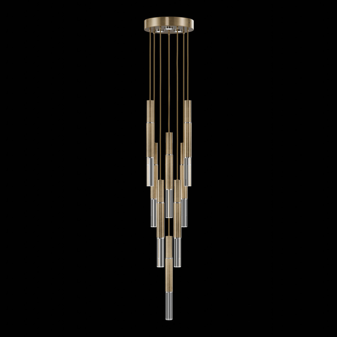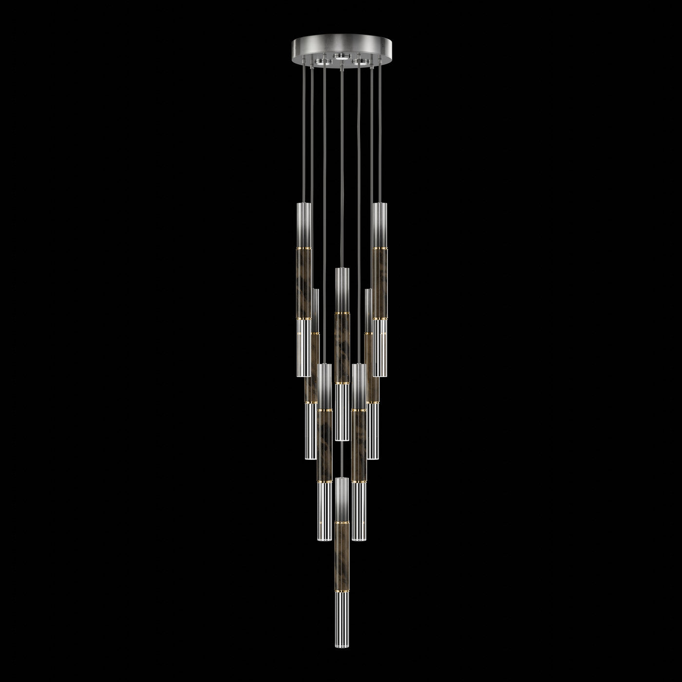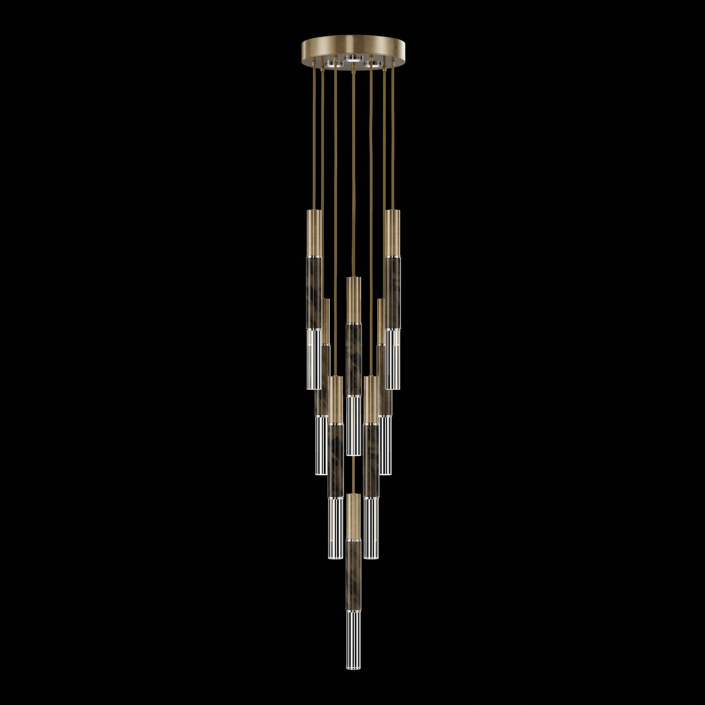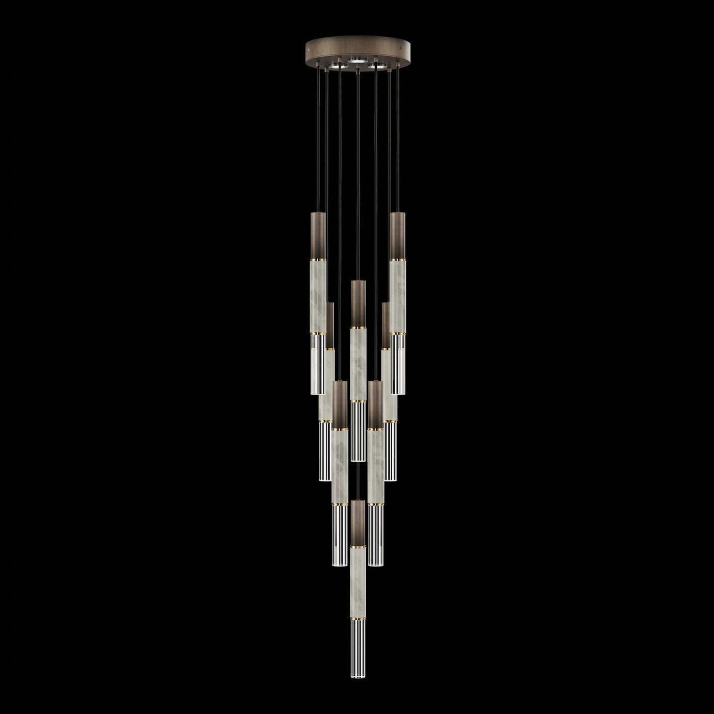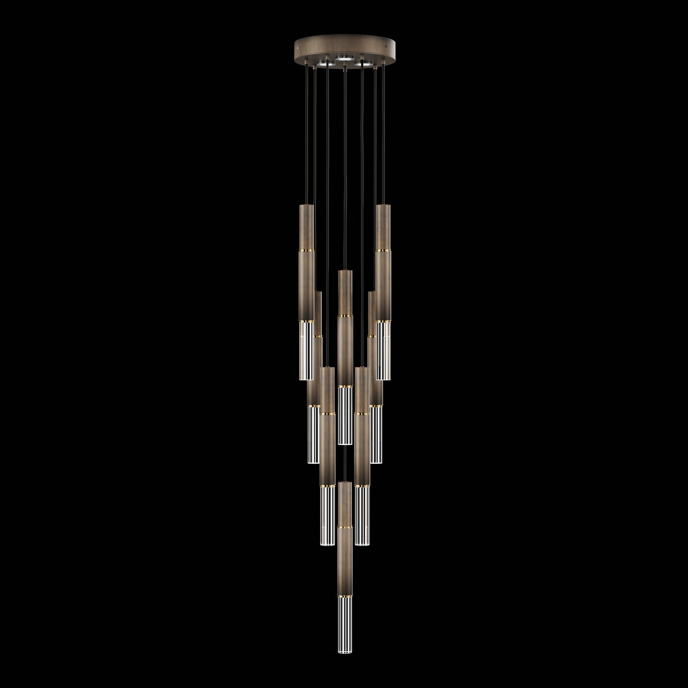 Suspended by adjustable cords, this LED fixture features straight tubular lines and the inclusion of metals carefully handcrafted to transition from parchment to magnificent glass, culminating in a stunning beam of light. Available in a wide range of exquisite finishes, including our five standard finishes and our newest Soft Ombre Bronze & Soft Ombre Silver, with the choice of two inline parchment colors, Charcoal and Smoke, and three special order options: Mink, Burnt Orange & Navy/Gold. Also available with no parchment.