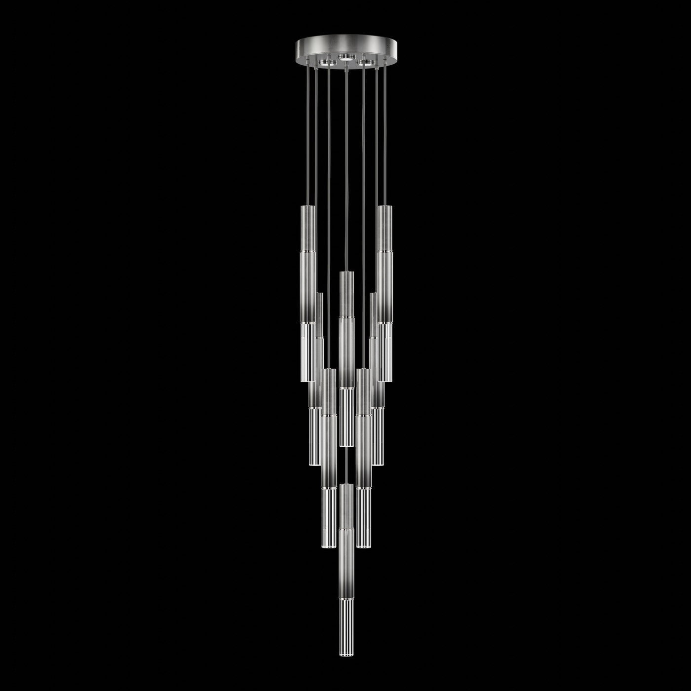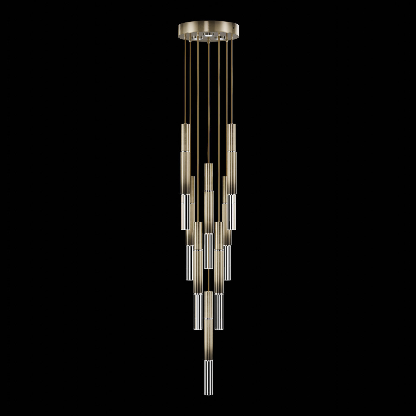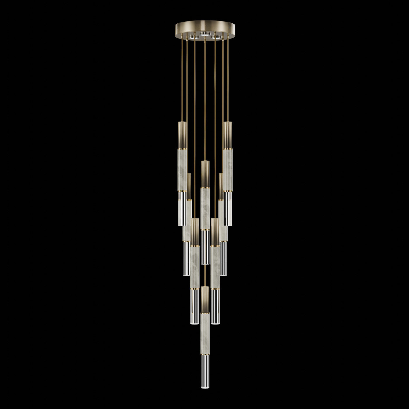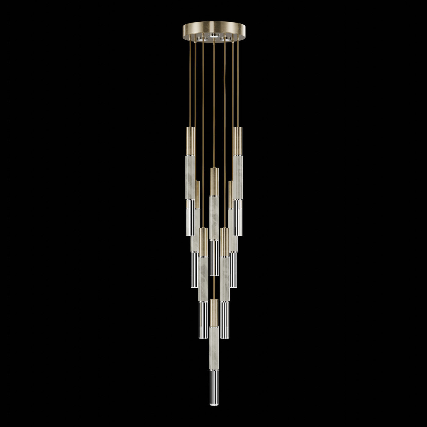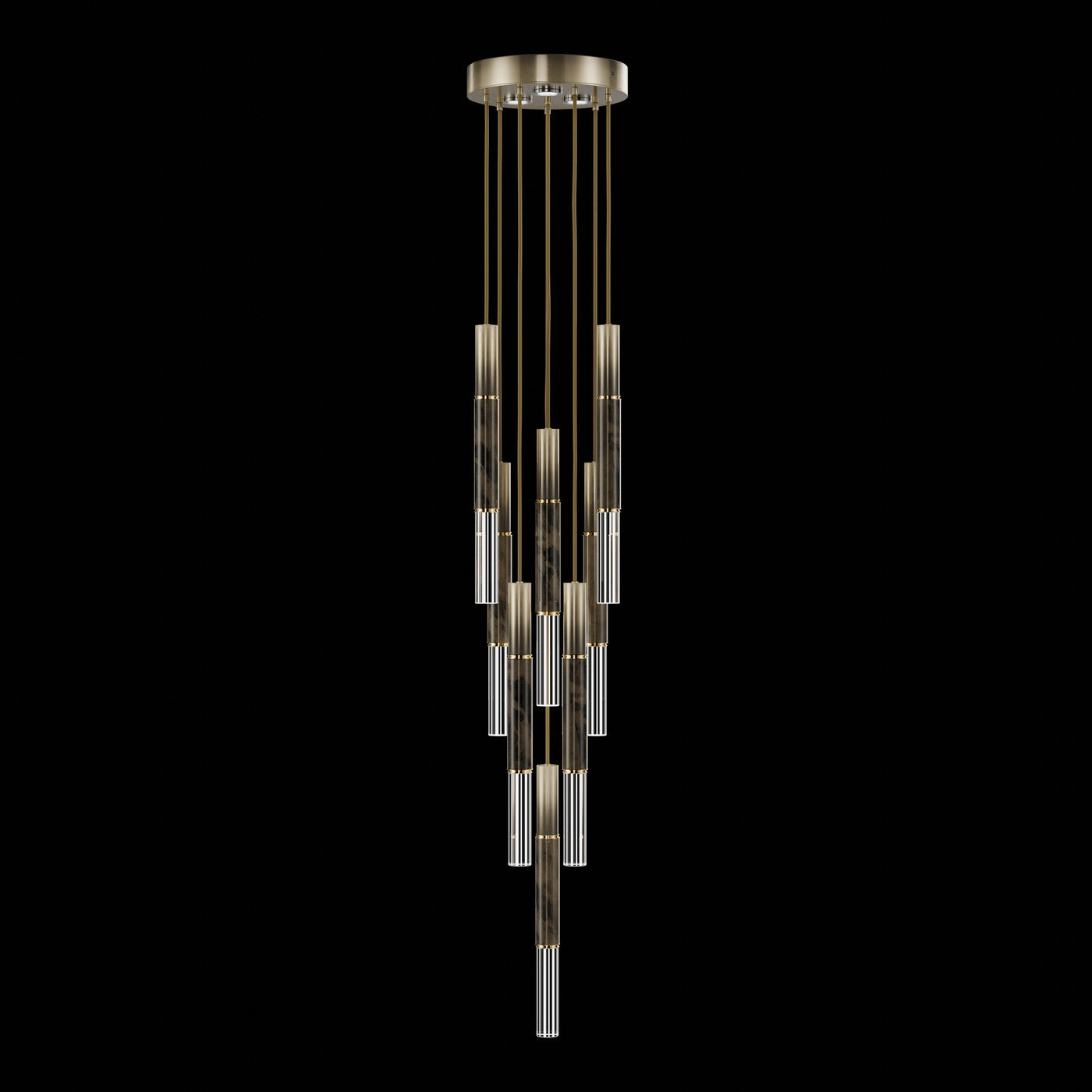 Suspended by adjustable cords, this LED fixture features straight tubular lines and the inclusion of metals carefully handcrafted to transition from parchment to magnificent glass, culminating in a stunning beam of light. Available in a wide range of exquisite finishes, including our five standard finishes and our newest Soft Ombre Bronze & Soft Ombre Silver, with the choice of two inline parchment colors, Charcoal and Smoke, and three special order options: Mink, Burnt Orange & Navy/Gold. Also available with no parchment.