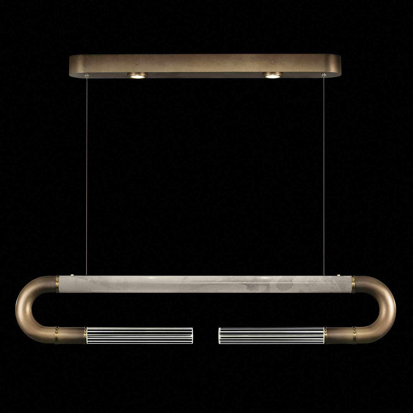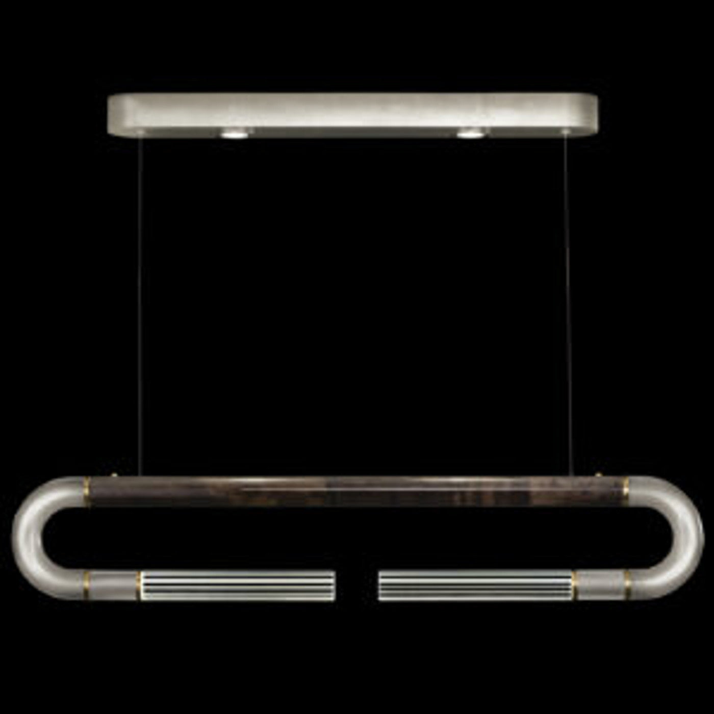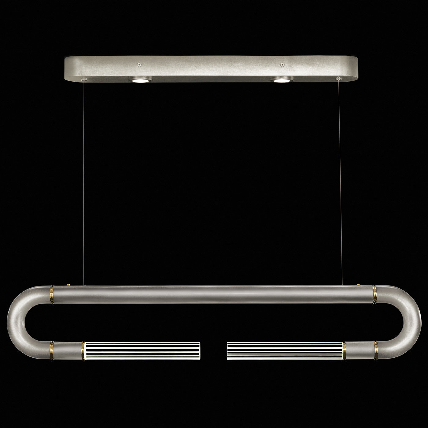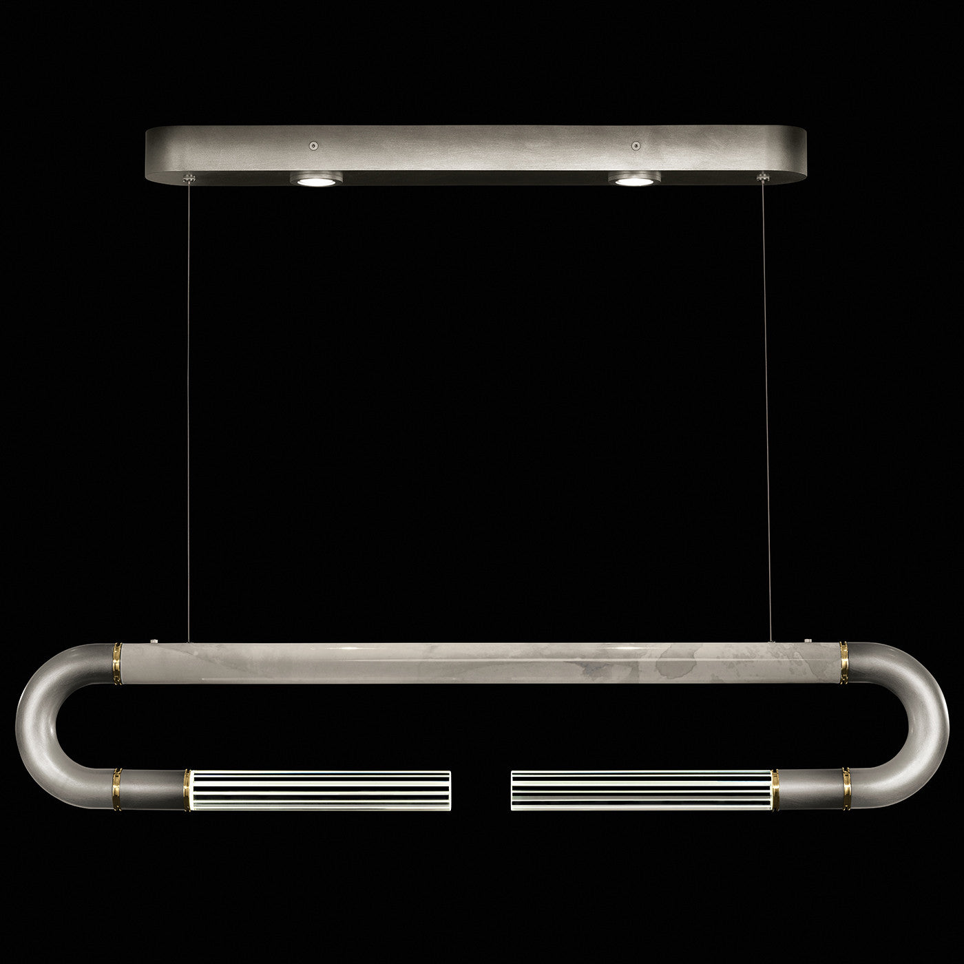 Pendant featuring soft curves and the inclusion of metals carefully handcrafted to transition from parchment to magnificent glass, culminating in a stunning beam of light. Adjustable cables suspend the pendant. Also available with no parchment.
