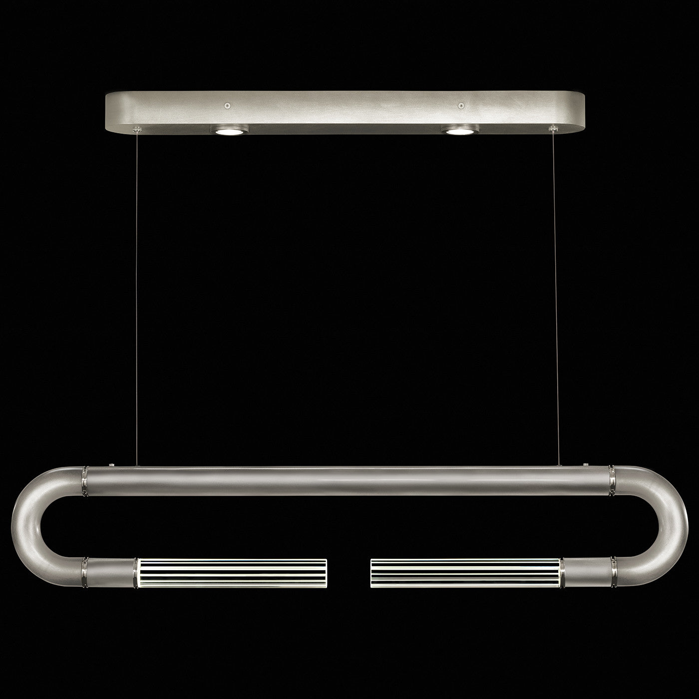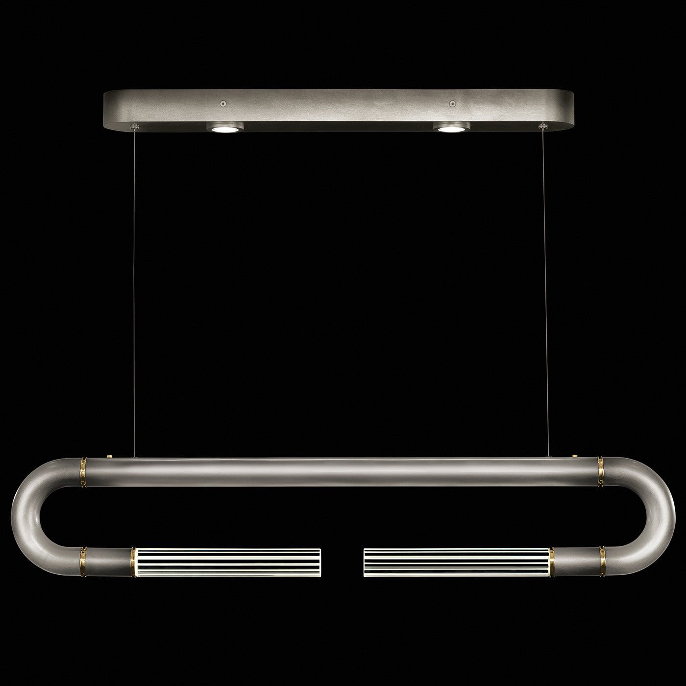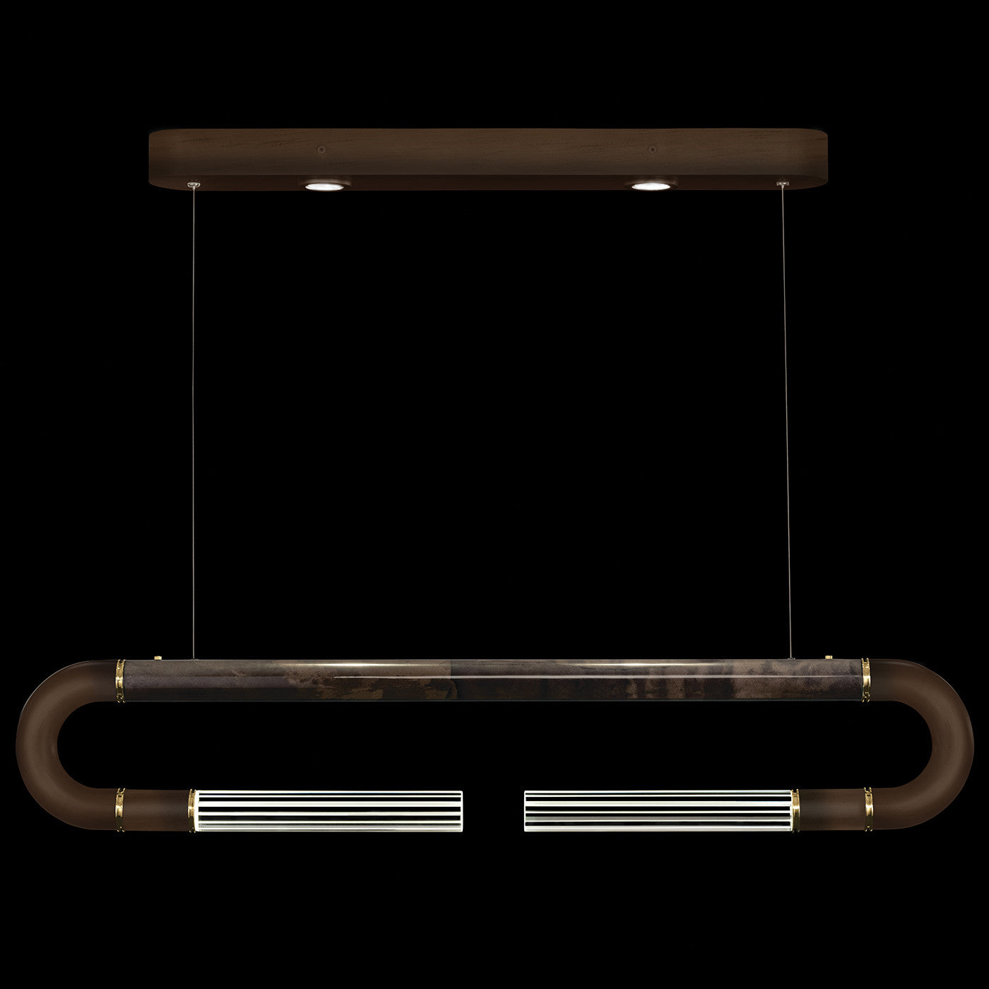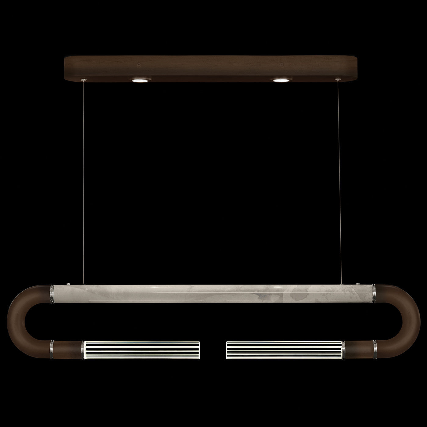 Pendant featuring soft curves and the inclusion of metals carefully handcrafted to transition from parchment to magnificent glass, culminating in a stunning beam of light. Adjustable cables suspend the pendant. Also available with no parchment.