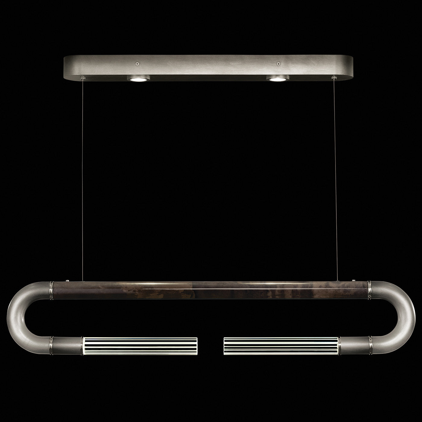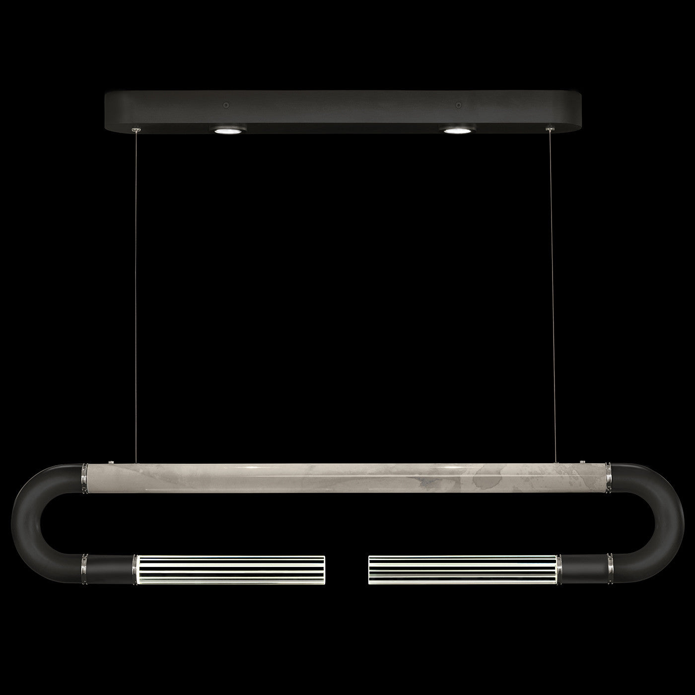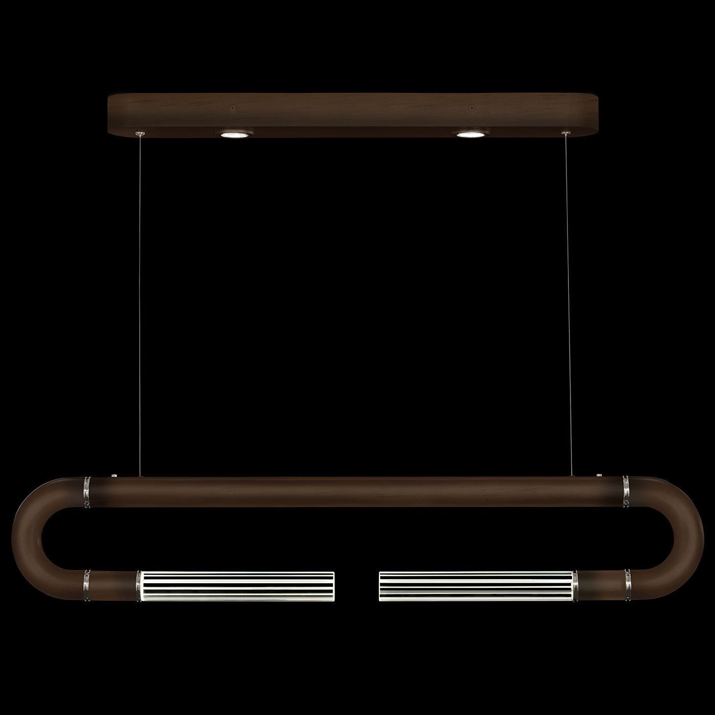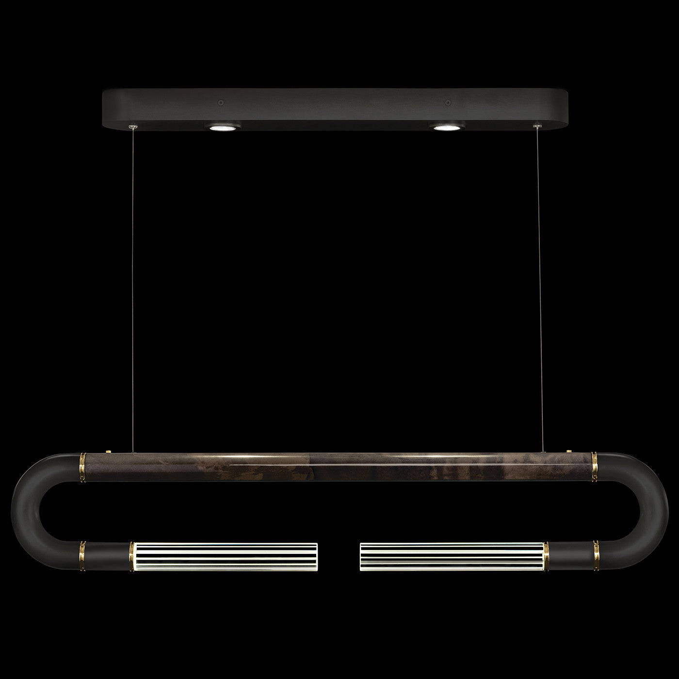 Pendant featuring soft curves and the inclusion of metals carefully handcrafted to transition from parchment to magnificent glass, culminating in a stunning beam of light. Adjustable cables suspend the pendant. Also available with no parchment.