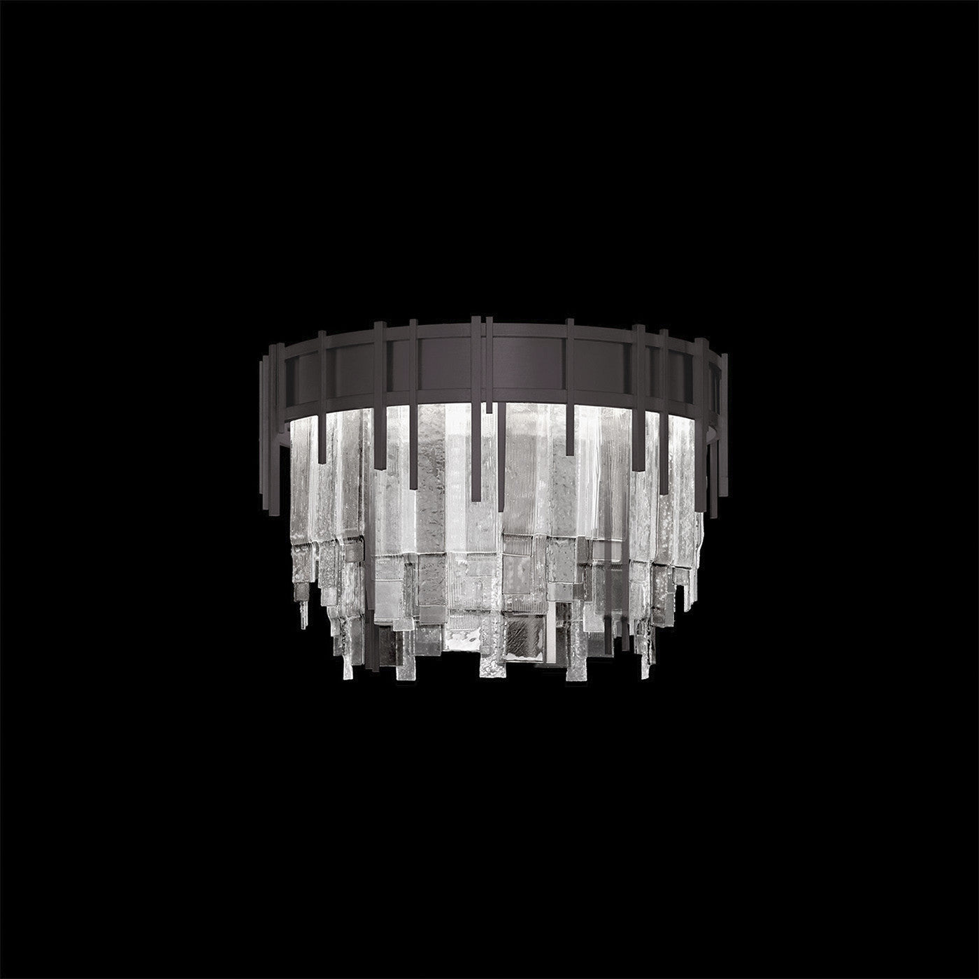 Color glass options feature textured glass panels masterfully layered and fused together in clear, or multi-tonal mix of clear, smoke, and bronze, with Midnight Steel or Soft Gold Leaf finish options.