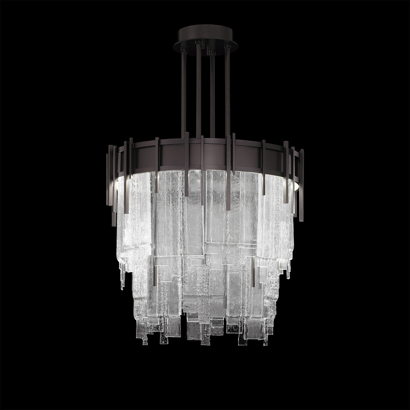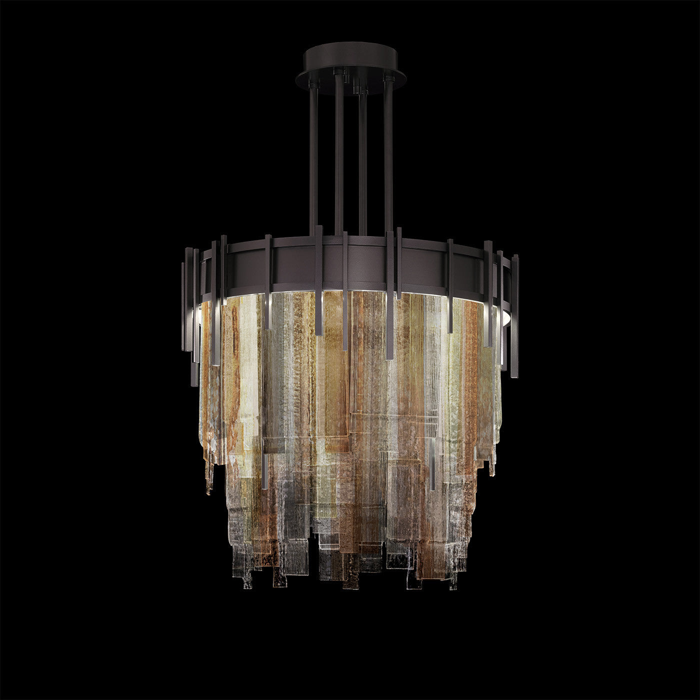 Color glass options feature textured glass panels masterfully layered and fused together in clear, or multi-tonal mix of clear, smoke, and bronze, with Midnight Steel or Soft Gold Leaf finish options.