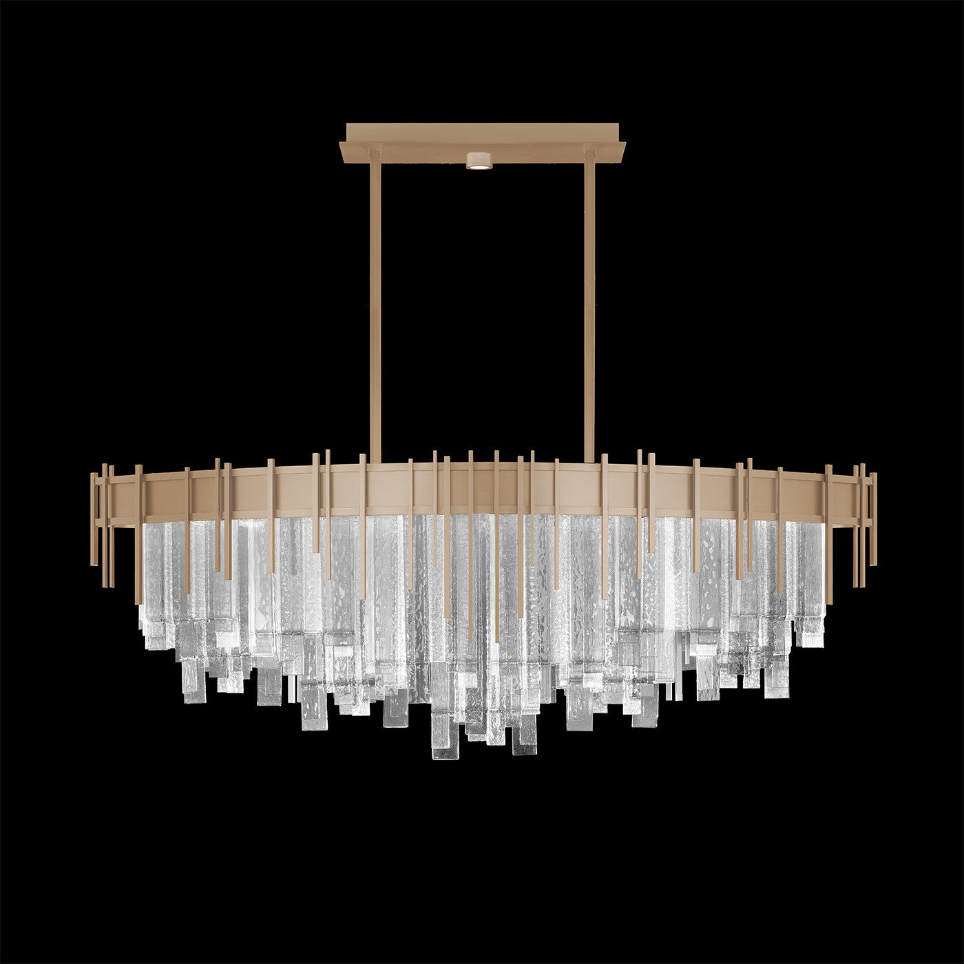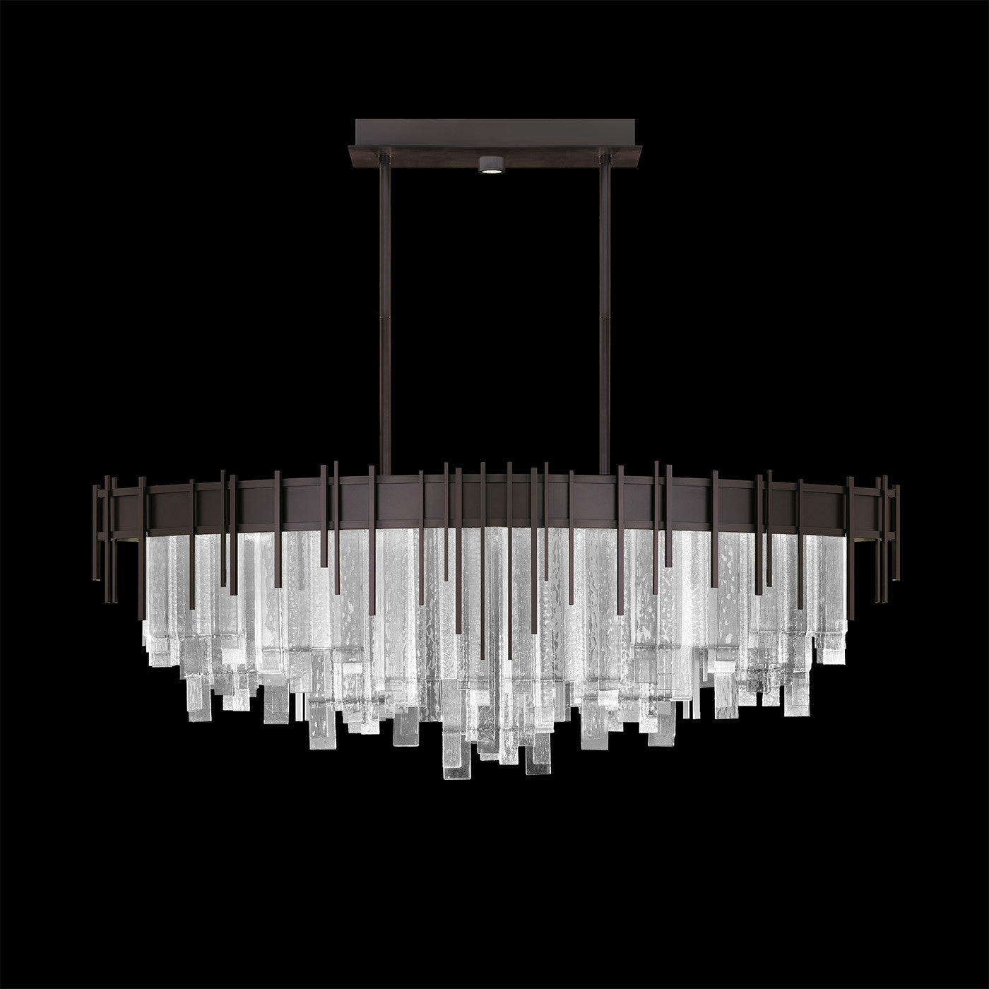 Color glass options feature textured glass panels masterfully layered and fused together in clear, or multi-tonal mix of clear, smoke, and bronze, with Midnight Steel or Soft Gold Leaf finish options.