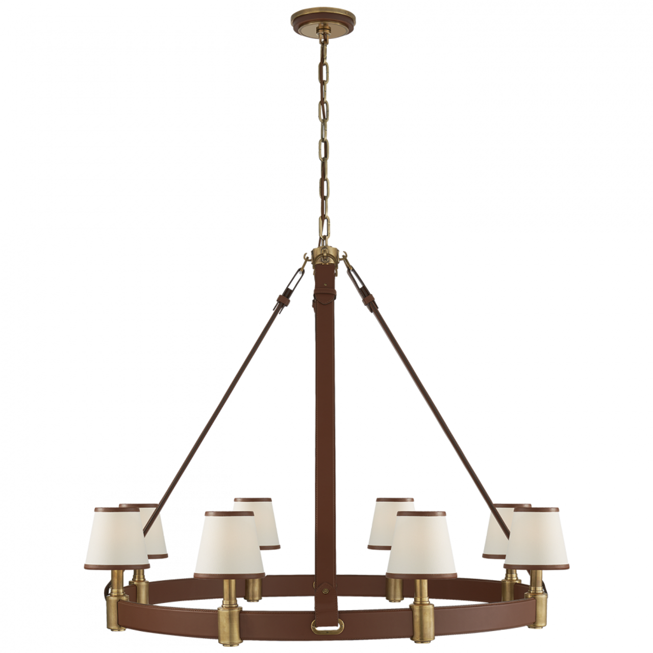 Elevate your space with the timeless elegance and modern flair of the Beatrice Large Pendant from Visual Comfort Signature, previously recognized as Visual Comfort. This exquisite fixture epitomizes the iconic style and sophistication synonymous with Ralph Lauren, offering a unique blend of classic design and contemporary accents. Suspended by an elegant chain of interconnected modern rings, the pendant boasts a sleek metal frame that gently curves into a classic shape, while presenting a streamlined silhouette as it narrows. The design's intrigue is heightened by its use of restoration glass panels, behind which lies an enchanting arrangement of lamp holders. Each holder cradles a candelabra bulb, collectively casting a warm, inviting glow that beautifully illuminates any room.