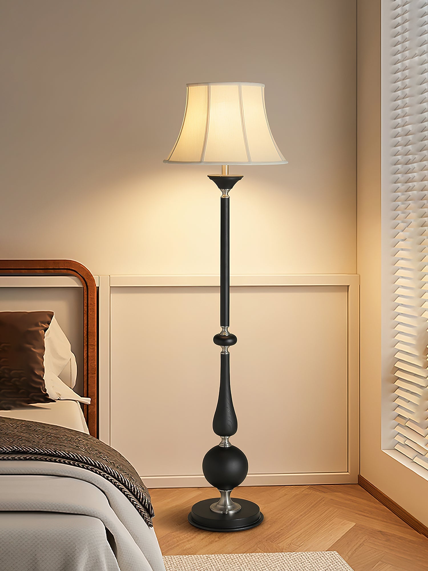 The Belfort Classic floor lamp from yovinolight perfectly blends timeless elegance with exquisite craftsmanship. Its slender black stem is accented with metal details, while its elegant, flared fabric shade emits a warm, captivating glow. The sculptural base cleverly blends curves and geometric shapes, adding visual interest and a sense of stability. Perfect for a living room, study, or reading nook, this floor lamp offers both refined and practical lighting, making it a versatile addition to any interior.