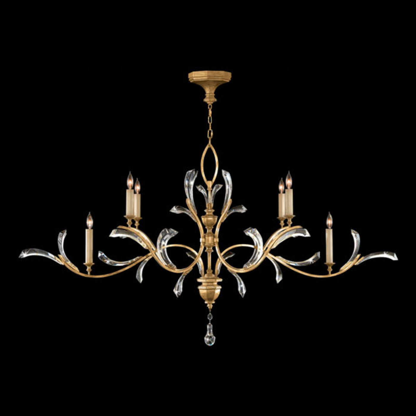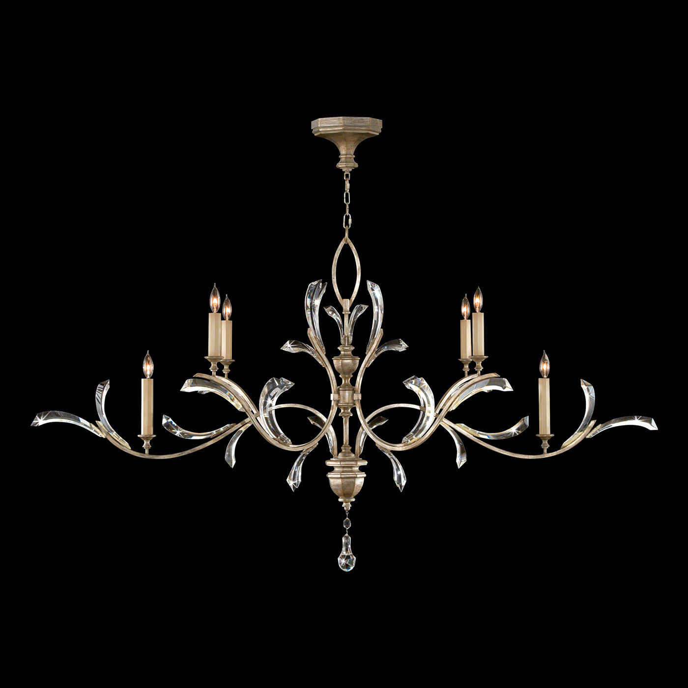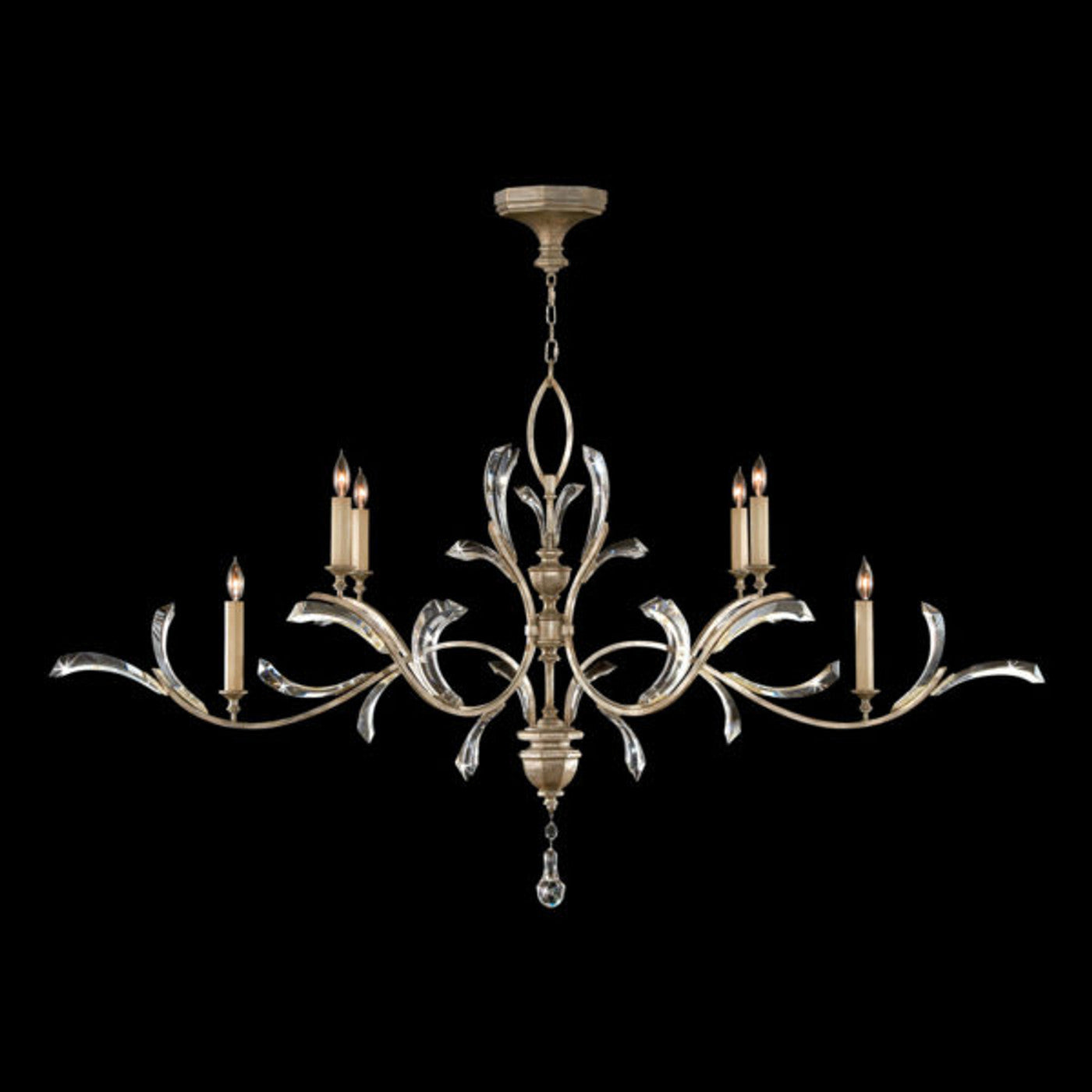 Oblong chandelier featuring beveled crystal accents. Available in Silver, Gold, Silver Leaf and Gold Leaf finish.