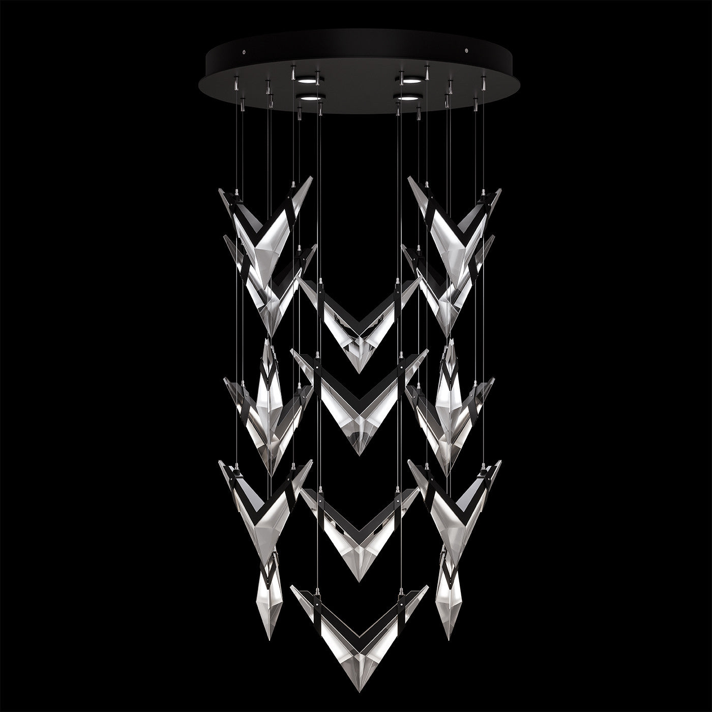 Inspired by the bold geometry of chevron shapes and the sleek lines of modern aircraft, Blade brings a sense of motion and precision to lighting design and merges sleek design with modern functionality. Pendant features cut crystal and integrated LEDs in Standard Black Iron or Champagne finish. Dark Walnut stained wood featured on select items adding warmth to the metal forms.