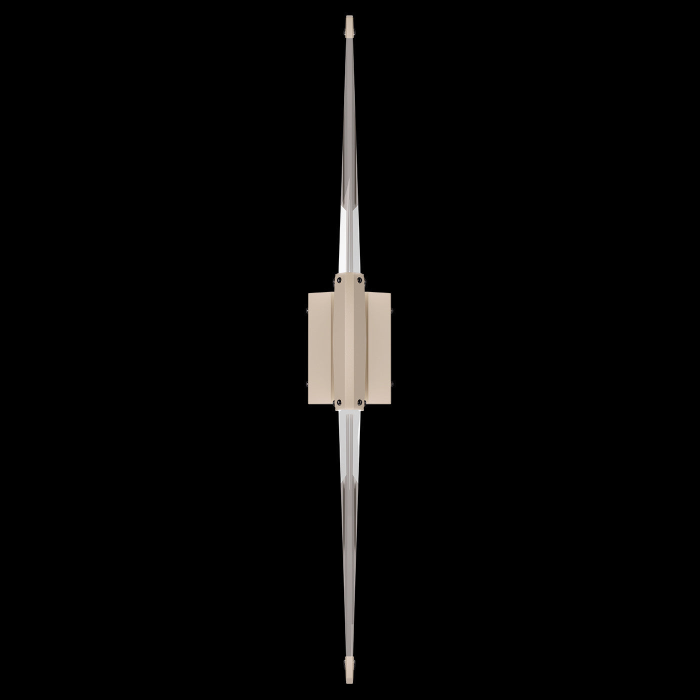 Inspired by the bold geometry of chevron shapes and the sleek lines of modern aircraft, Blade brings a sense of motion and precision to lighting design. Sconce features cut crystal and integrated LEDs in Standard Black Iron or Champagne finish. Dark Walnut stained wood featured on select items adding warmth to the metal forms. Can be mounted horizontally, vertically or on a ceiling.