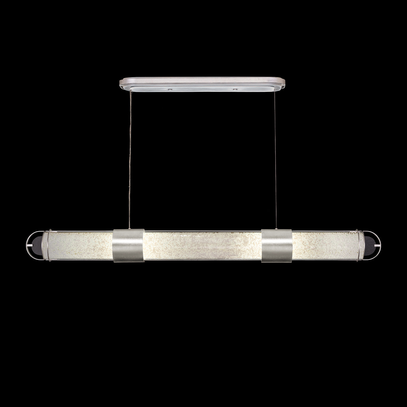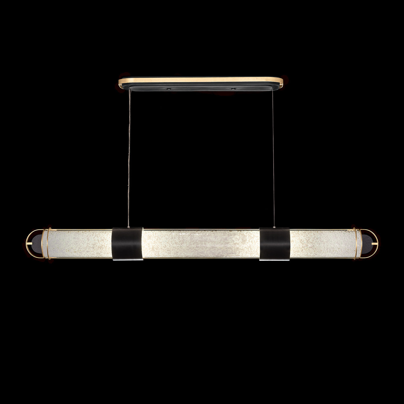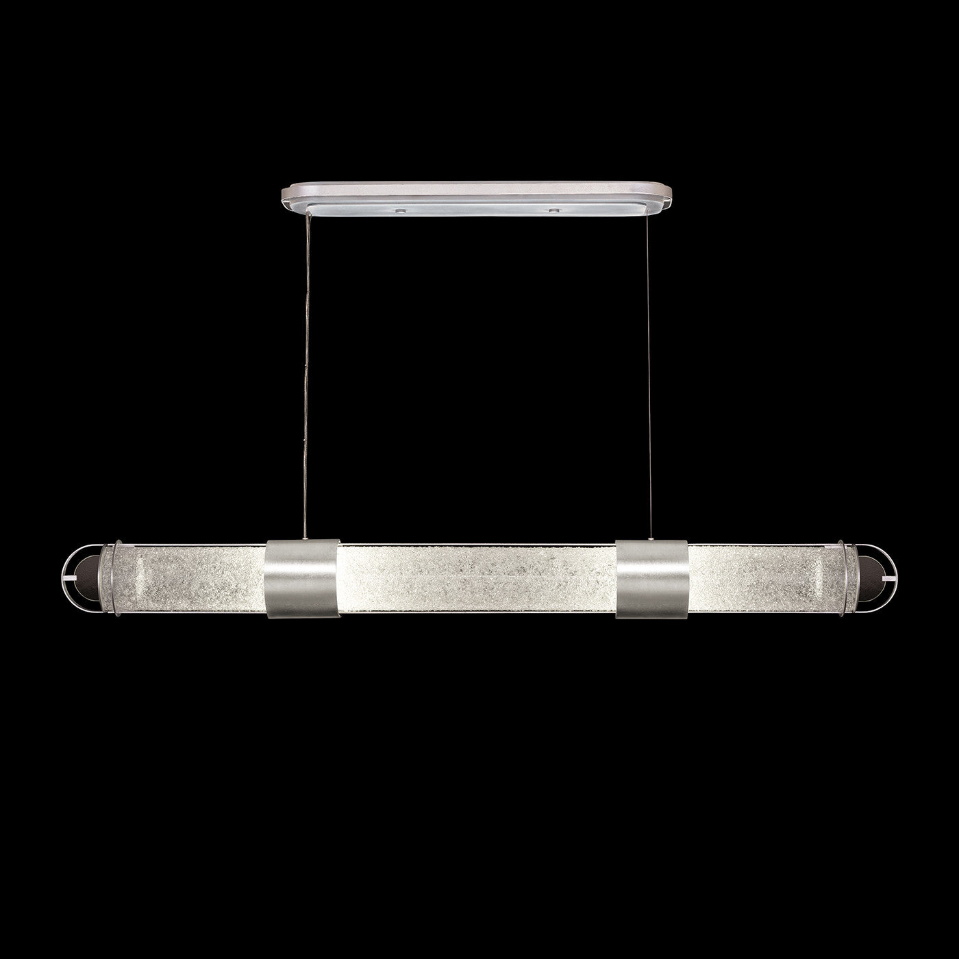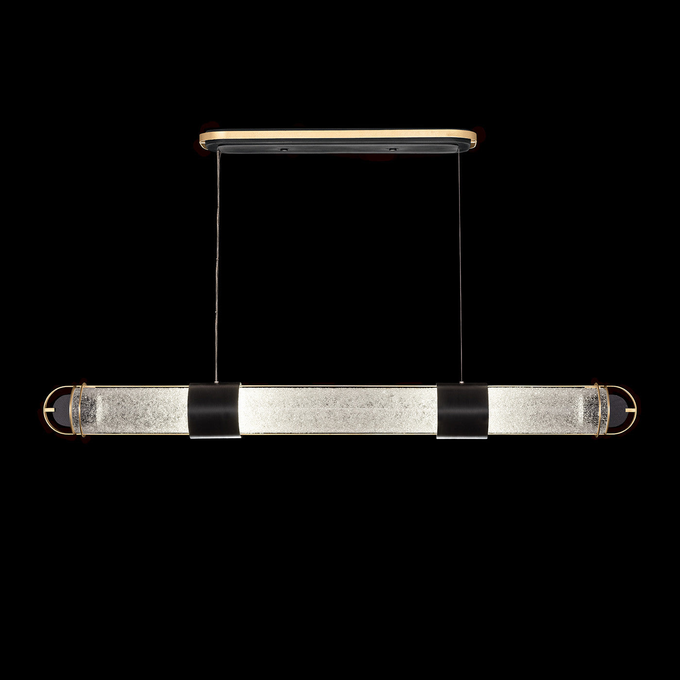 LED pendant featuring illuminated cylinders formed by handcrafted glass set within a silhouette, beautifully lit from within, spanning space vertically or horizontally. Available in Black & Silver, Black & Gold, Gold and Silver finish with either Diamond Blanket Glass or Bahama Sand Glass. Rod comes in connectable segments for a customizable length.