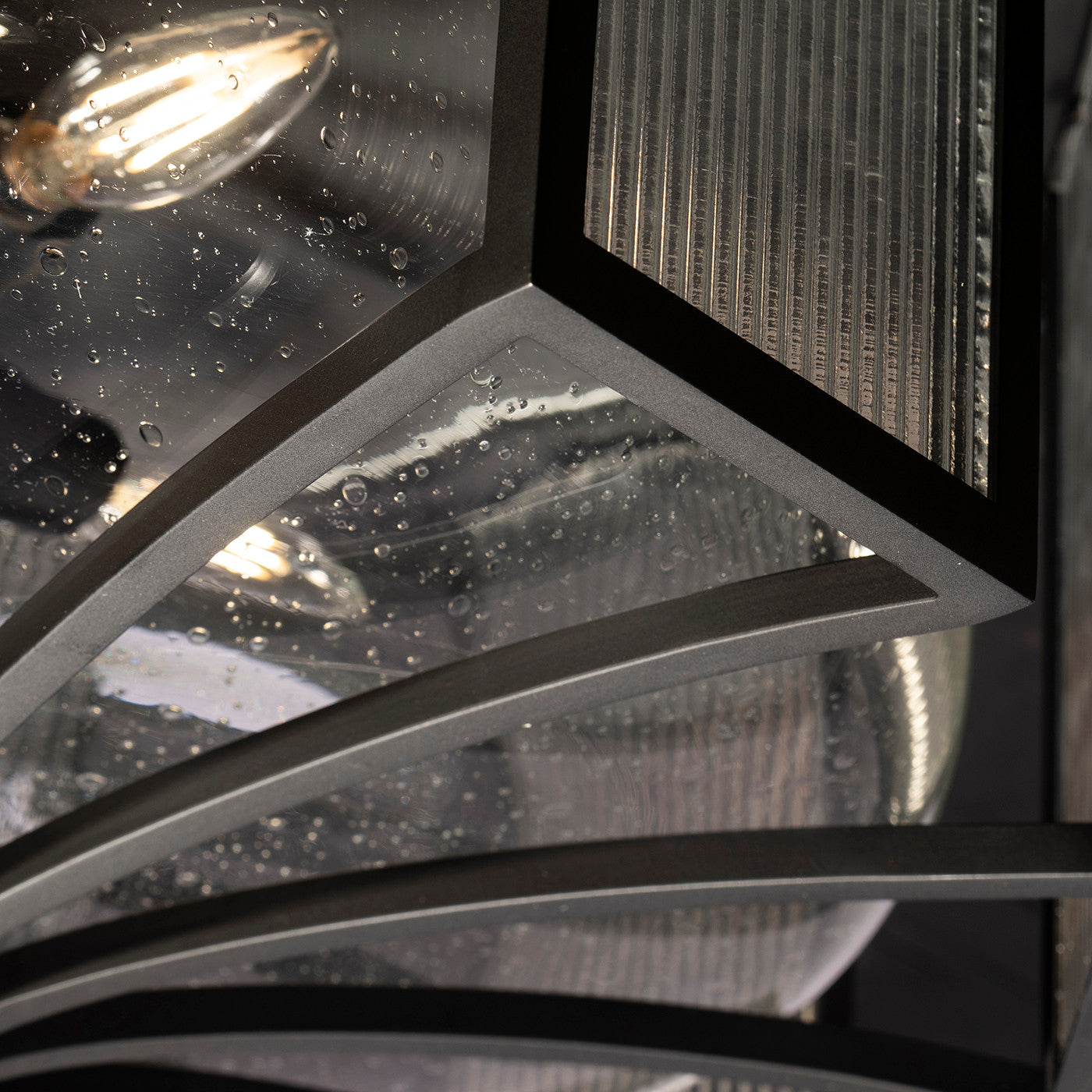 Boldly designed yet quietly subtle, this outdoor flush mount features seedy inner glass with an overlay of reeded glass panels. Offered in a hand-rubbed black iron finish.